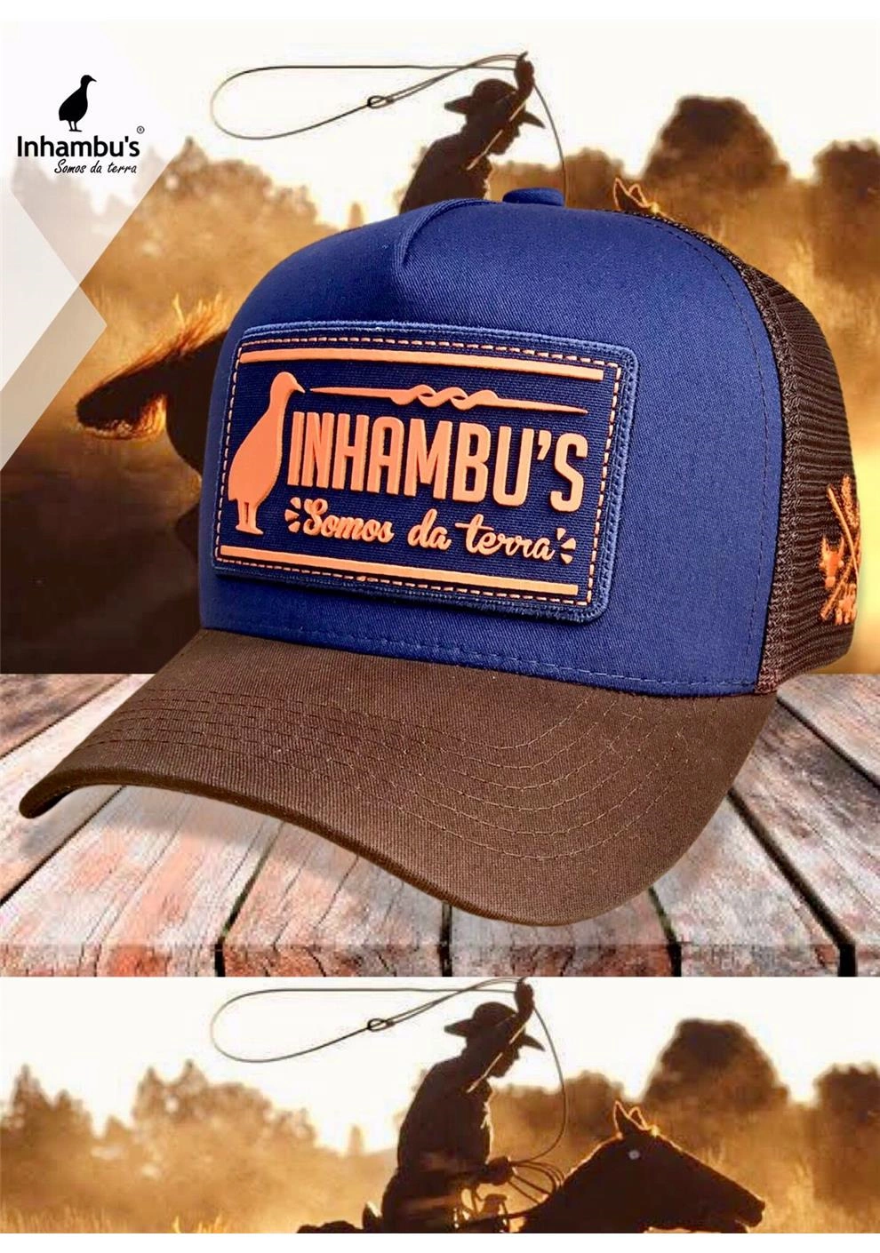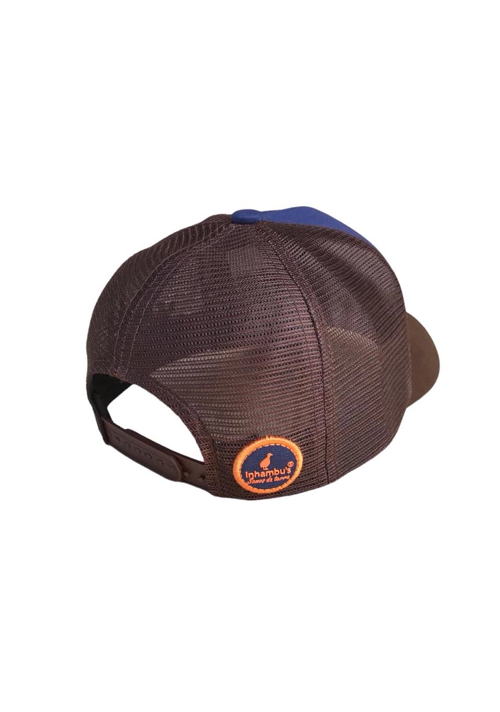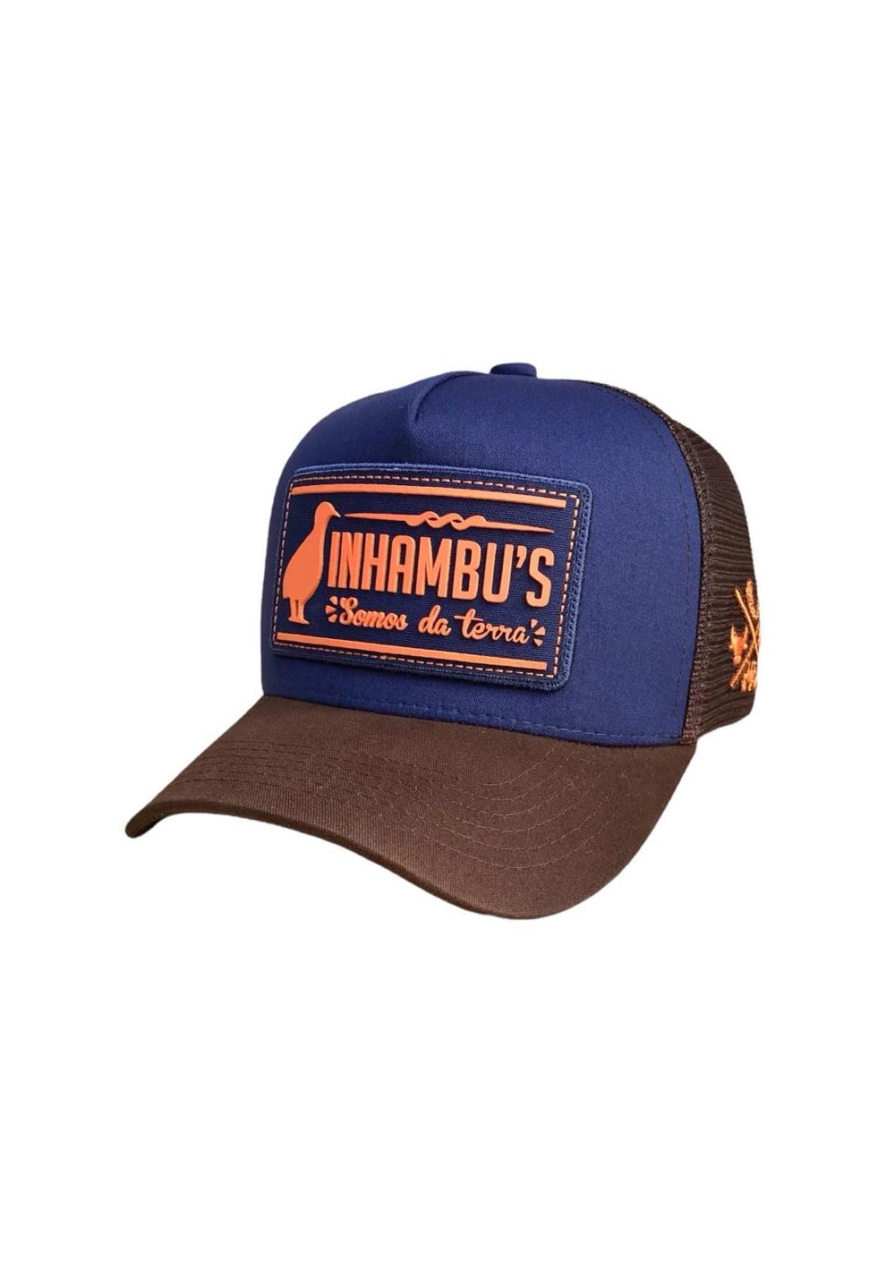 BONÉ INHAMBU'S ESTILO TRUCKER EM SARJA AZUL, VIÉS PERSONALIZADO, FORRO PERSONALIZADO, ESPELHAMENTO INTERNO, ABA COM 6 COSTURAS EM SARJA COR MARROM, TELA NA COR MARROM, CARNEIRA LARGA, ENTRETELA DE MEMÓRIA, REGULADOR PLÁSTICO, APLIQUE PATCH FRONTAL SILKADO, BORDADO UNI LATERAL E APLIQUE TRASEIRO REDONDO COM SILK ALTO RELEVO.
