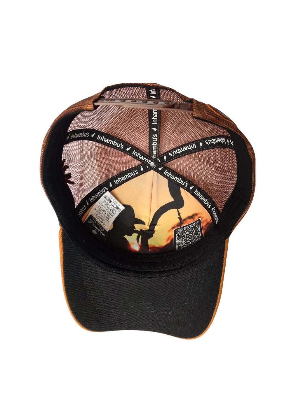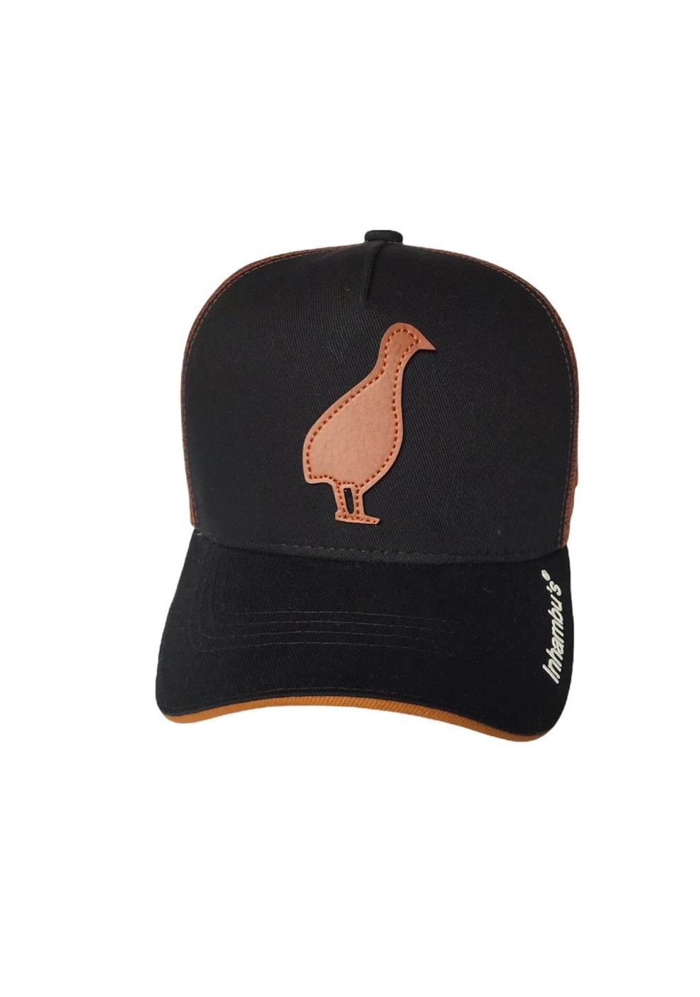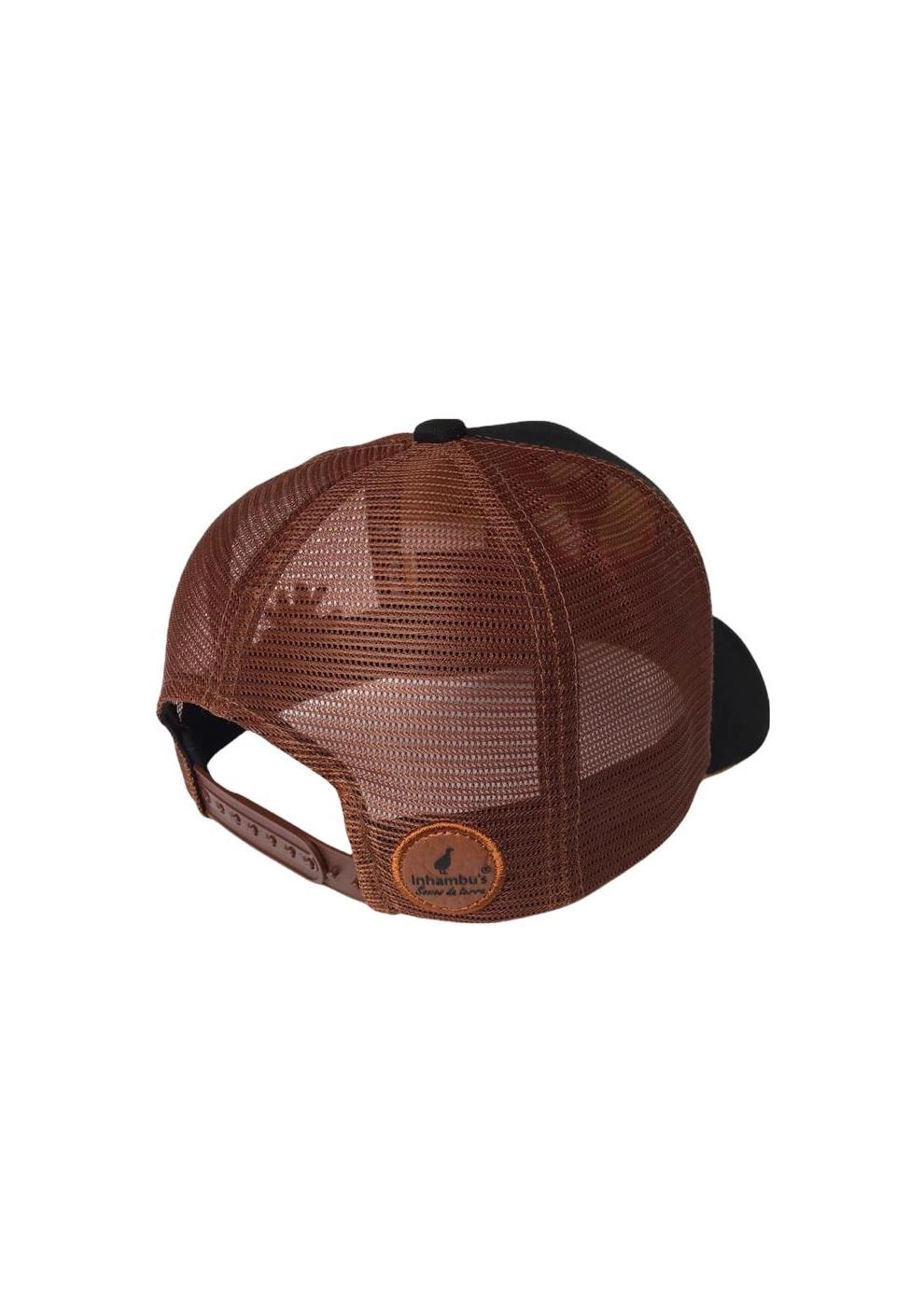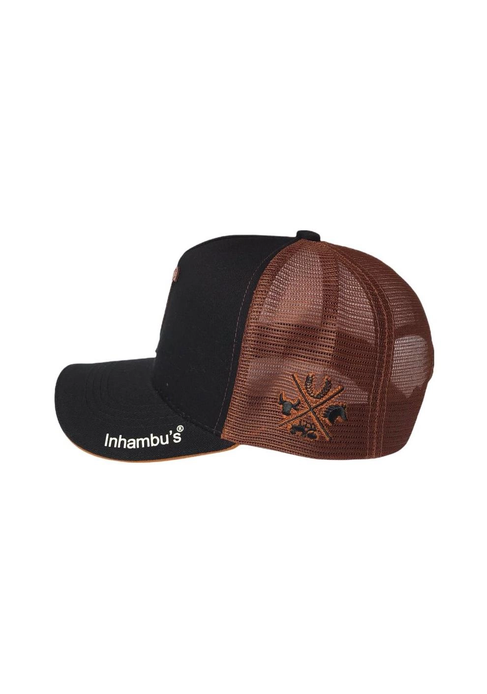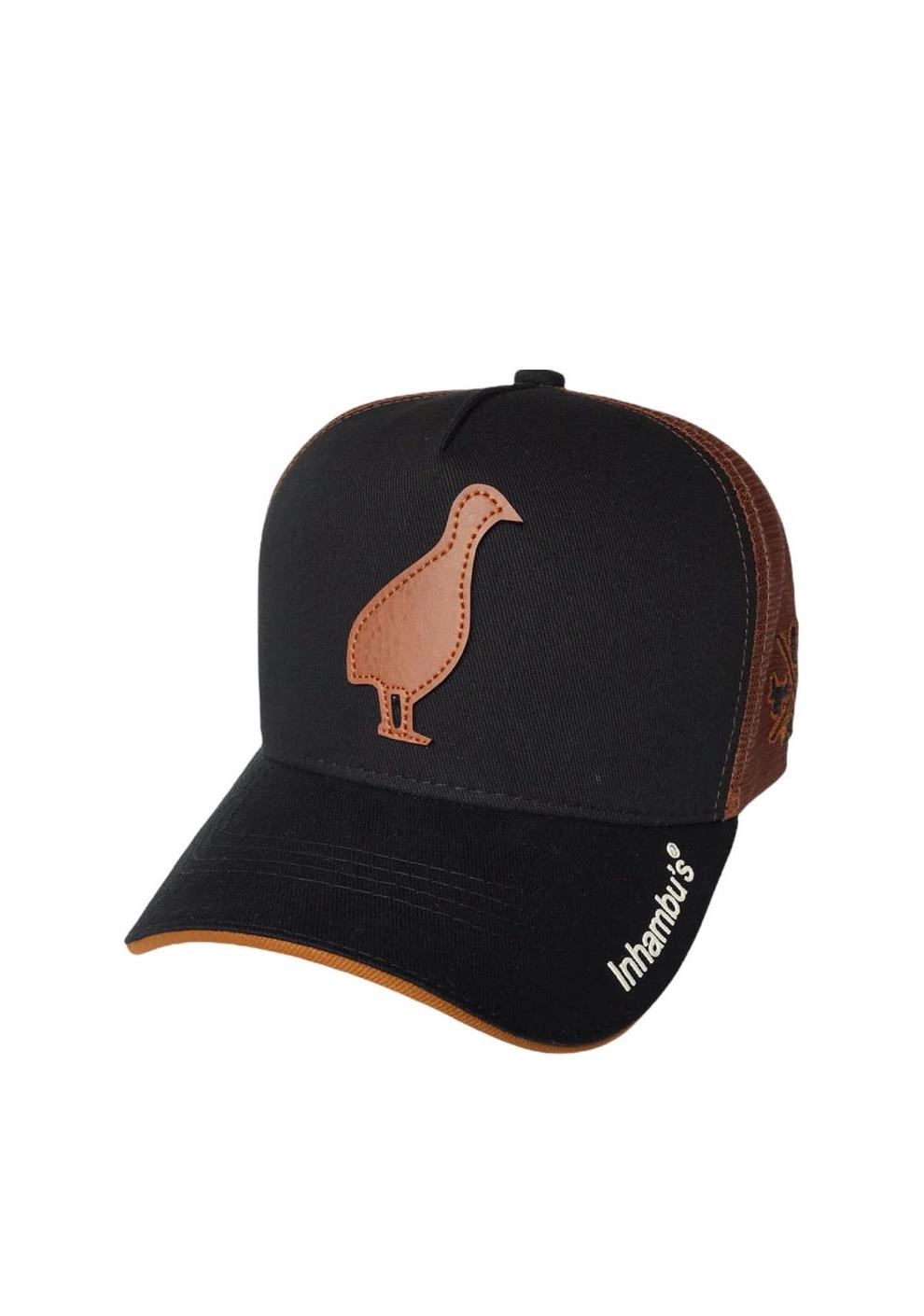 BONÉ INHAMBU'S ABA CURVA ESTILO TRUCKER EM SARJA NA COR PRETO, VIÉS PERSONALIZADO, ESPELHAMENTO INTERNO, ABA COM 6 COSTURAS PRETO + SANDUÍCHE NA COR MARROM, TELA NA COR CARAMELO, CARNEIRA LARGA, ENTRETELA DE MEMÓRIA, REGULADOR PLÁSTICO, APLIQUE EM COURO RECORTADO A LASER FRONTAL, BORDADO LATERAL E APLIQUE TRASEIRO EM COURO SILKADO.