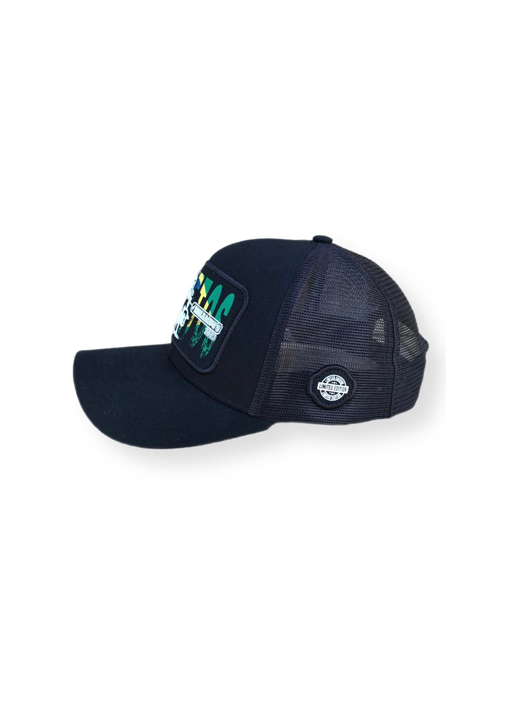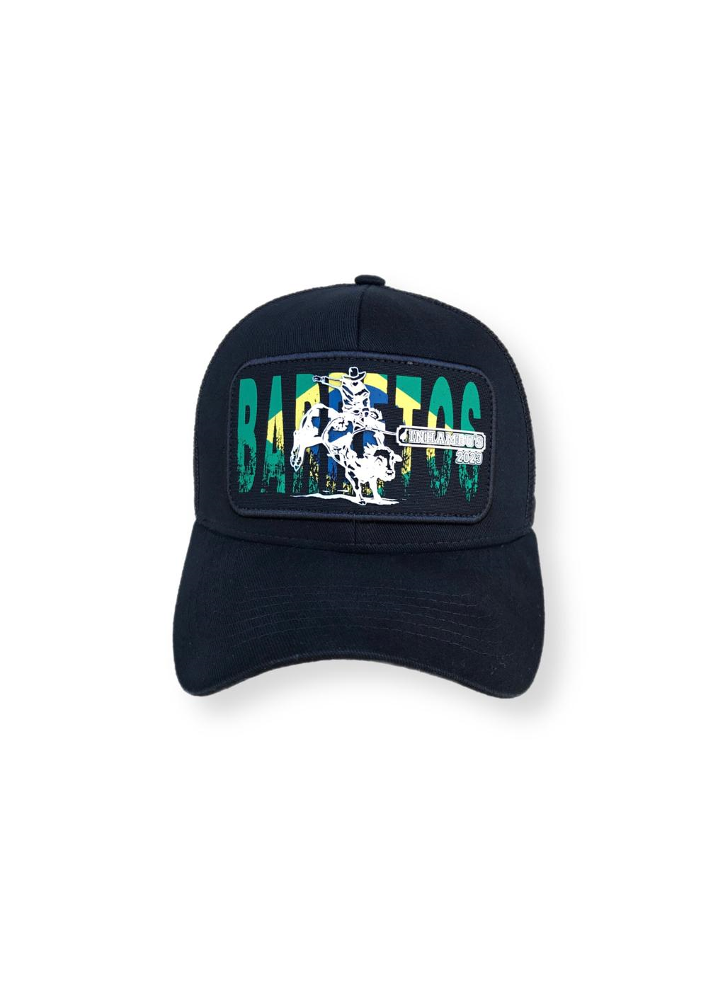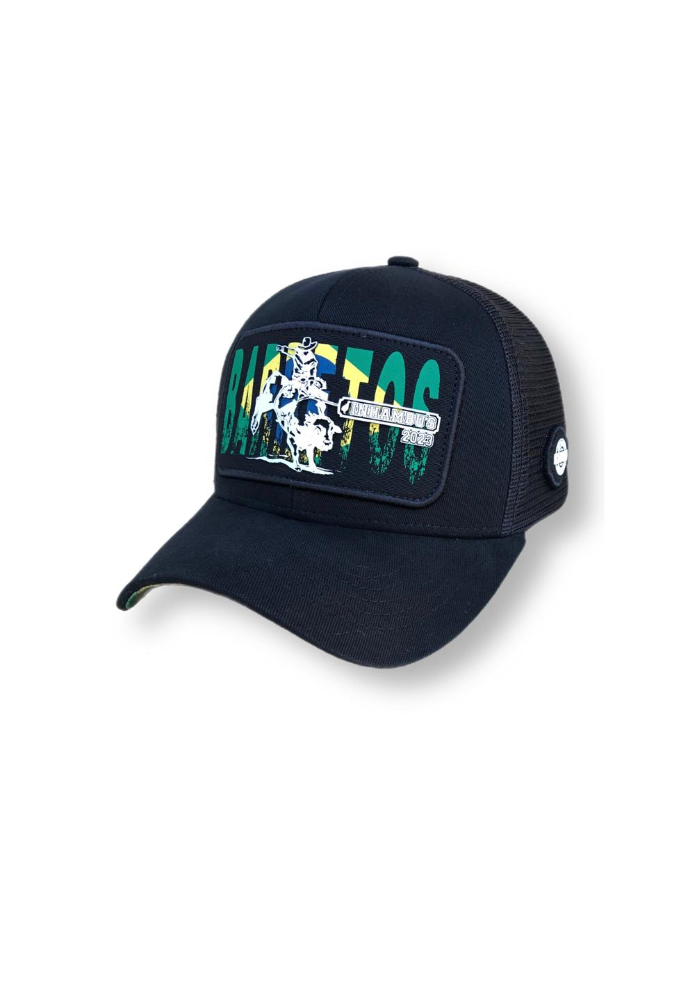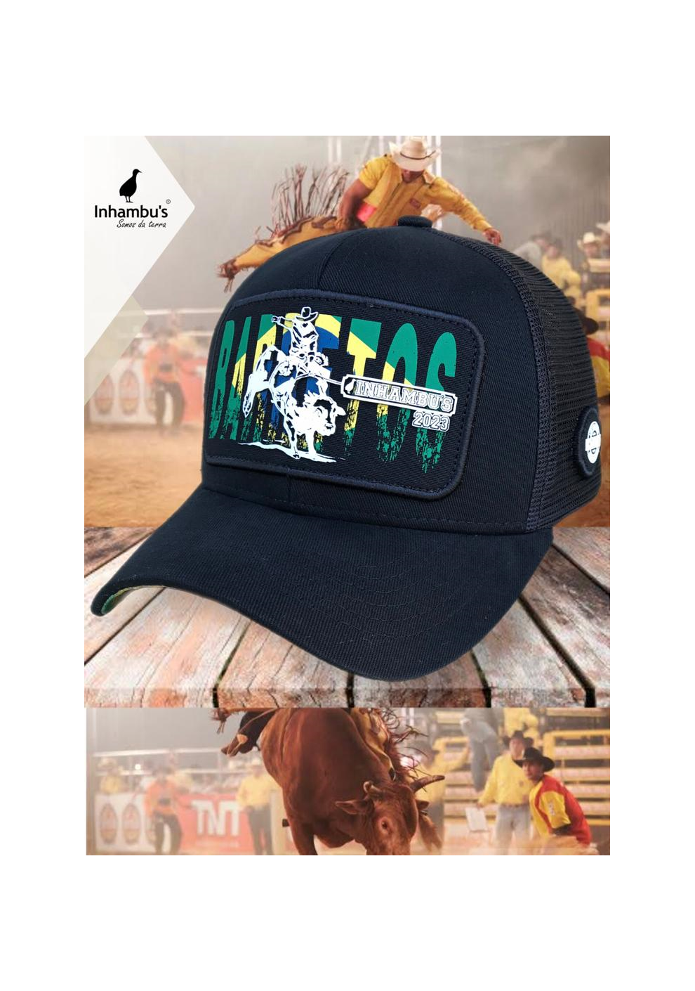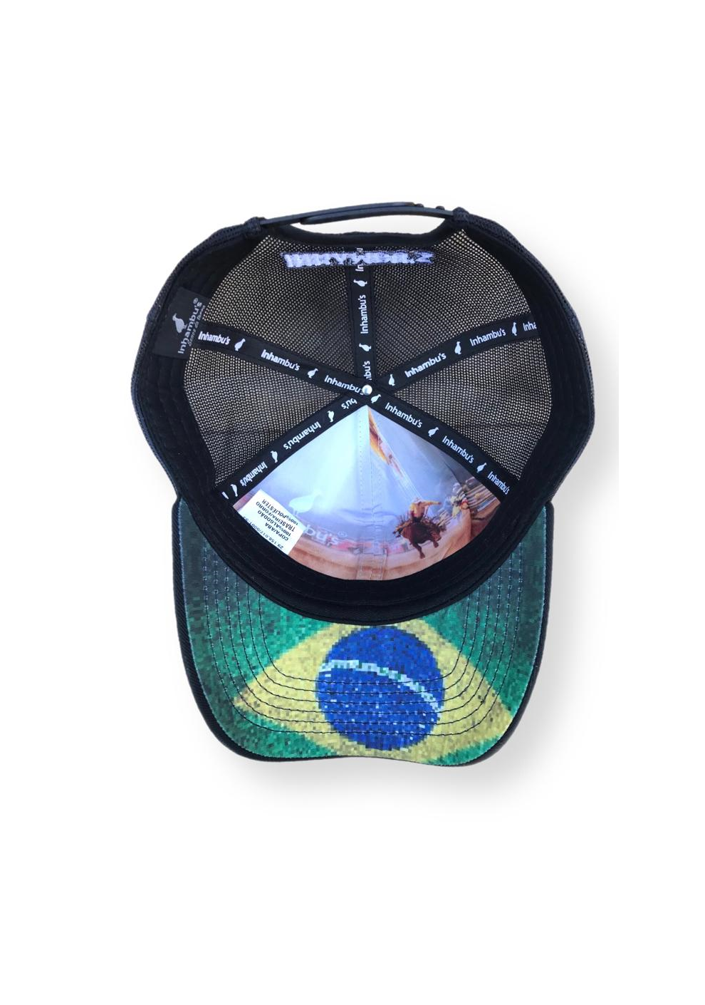BONÉ INHAMBU'S ESTILO TRUCKER COM FRENTE EM SARJA NA COR PRETO ABA NA COR PRETO SUPERIOR E BANDEIRA DO BRASIL INFERIOR, VIÉS PERSONALIZADO, FORRO PERSONALIZADO,ESPELHAMENTO INTERNO, ABA COM 6 COSTURAS, TELA NA COR PRETO, CARNEIRA LARGA, ENTRETELA DE MEMORIA, REGULADOR PLÁSTICO, APLIQUE FRONTAL EM PATCH COM SILK ALTO RELEVO, APLIQUE LATERAL EM PATCH SILKADO E APLIQUE TRASEIRO EM PATCH E SILK ALTO RELEVO.