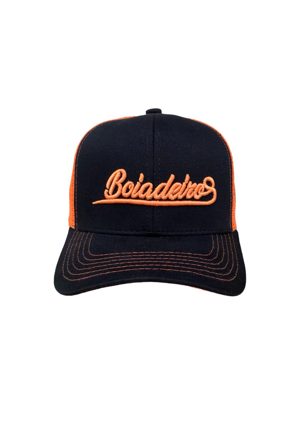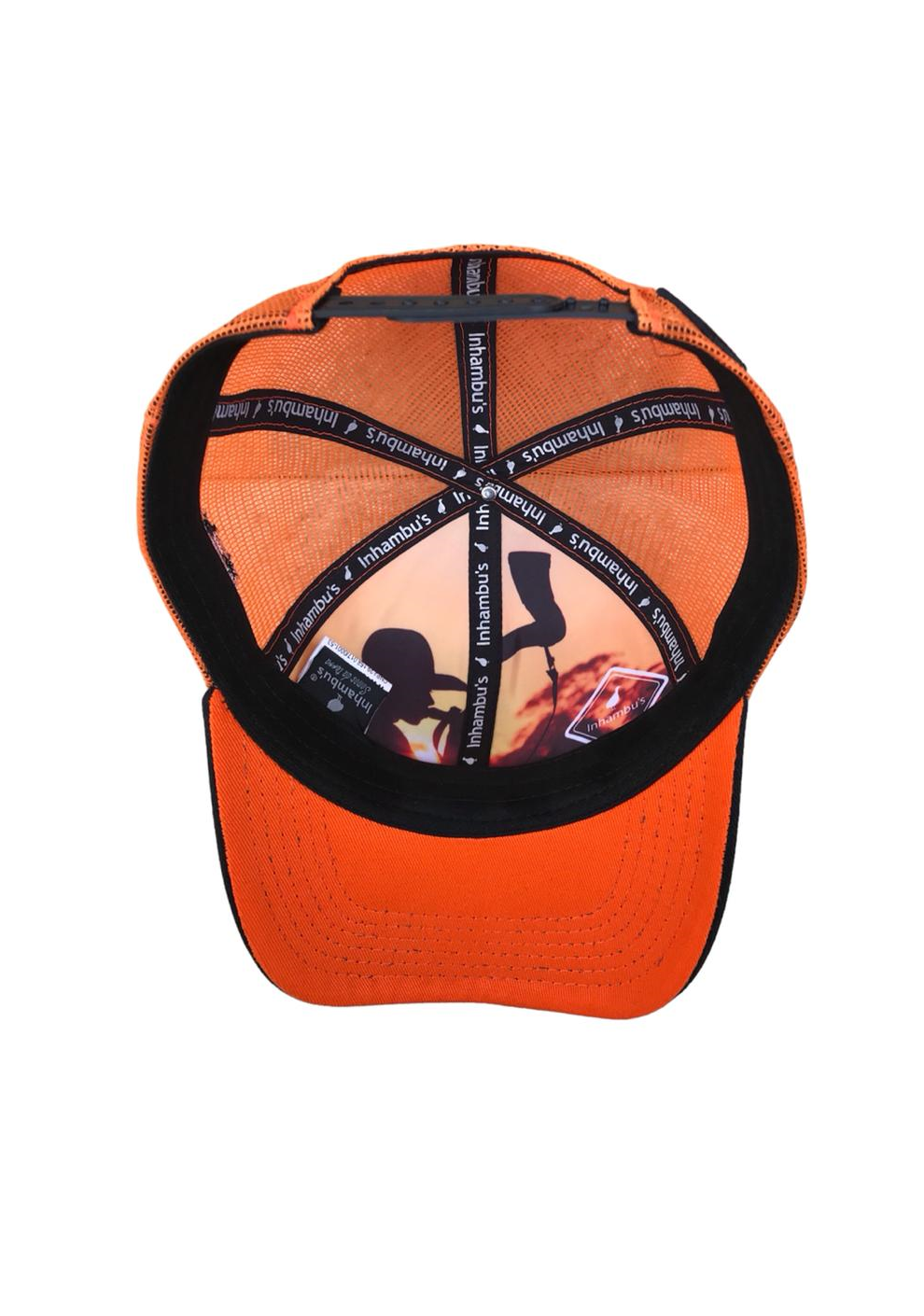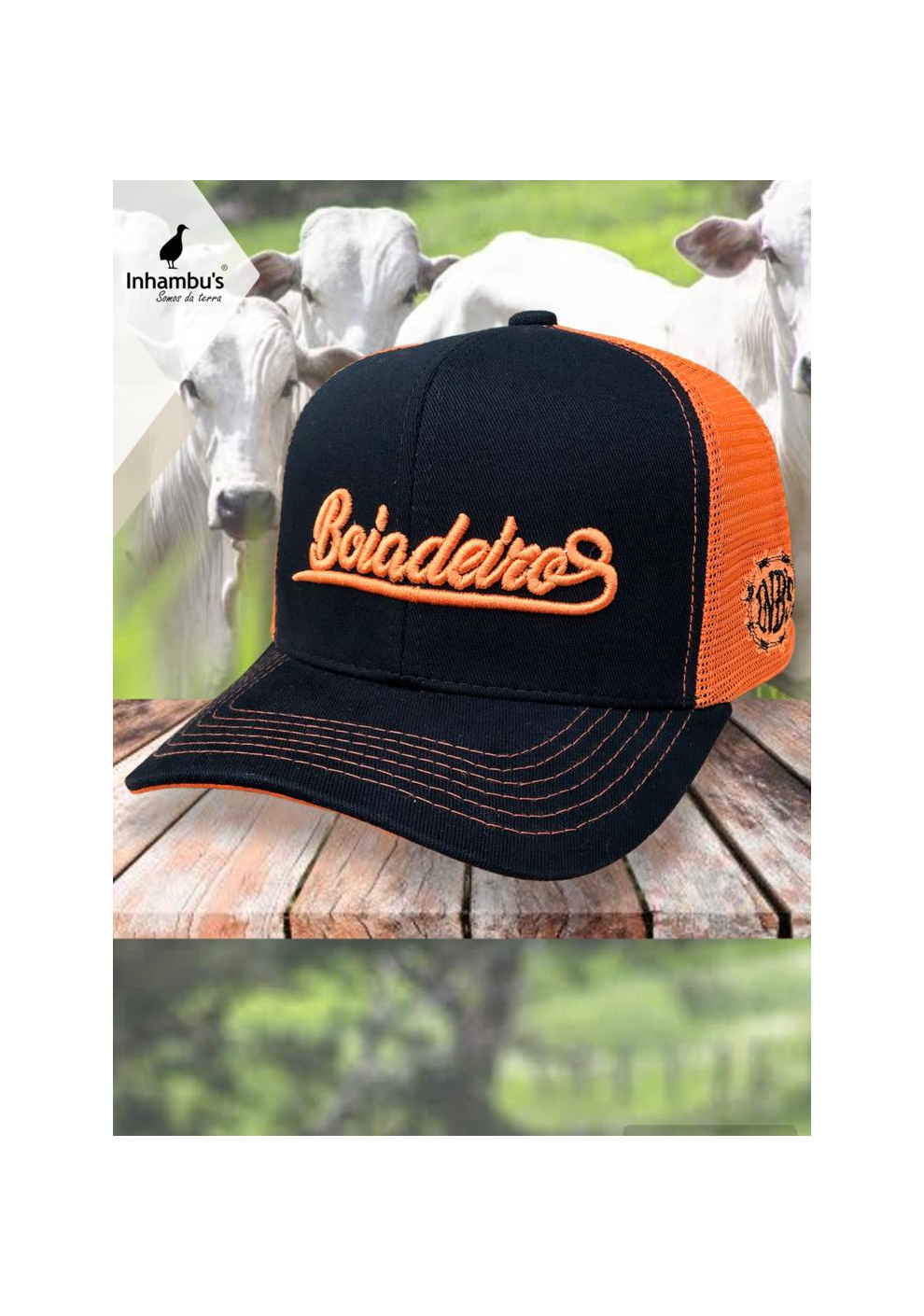 BONÉ INHAMBU'S ESTILO SEIS GOMOS COM FRENTE EM SARJA NA COR PRETO ABA NA COR PRETO SUPERIOR E LARANJA INFERIOR, VIÉS PERSONALIZADO, FORRO PERSONALIZADO,ESPELHAMENTO INTERNO, ABA COM 6 COSTURAS, TELA NA COR LARANJA, CARNEIRA LARGA, ENTRETELA DE MEMORIA, REGULADOR PLÁSTICO, BORDADO FRONTAL LARANJA EM ALTO RELEVO, BORDADO LATERAL E APLIQUE TRASEIRO EM PATCH E SILK ALTO RELEVO.