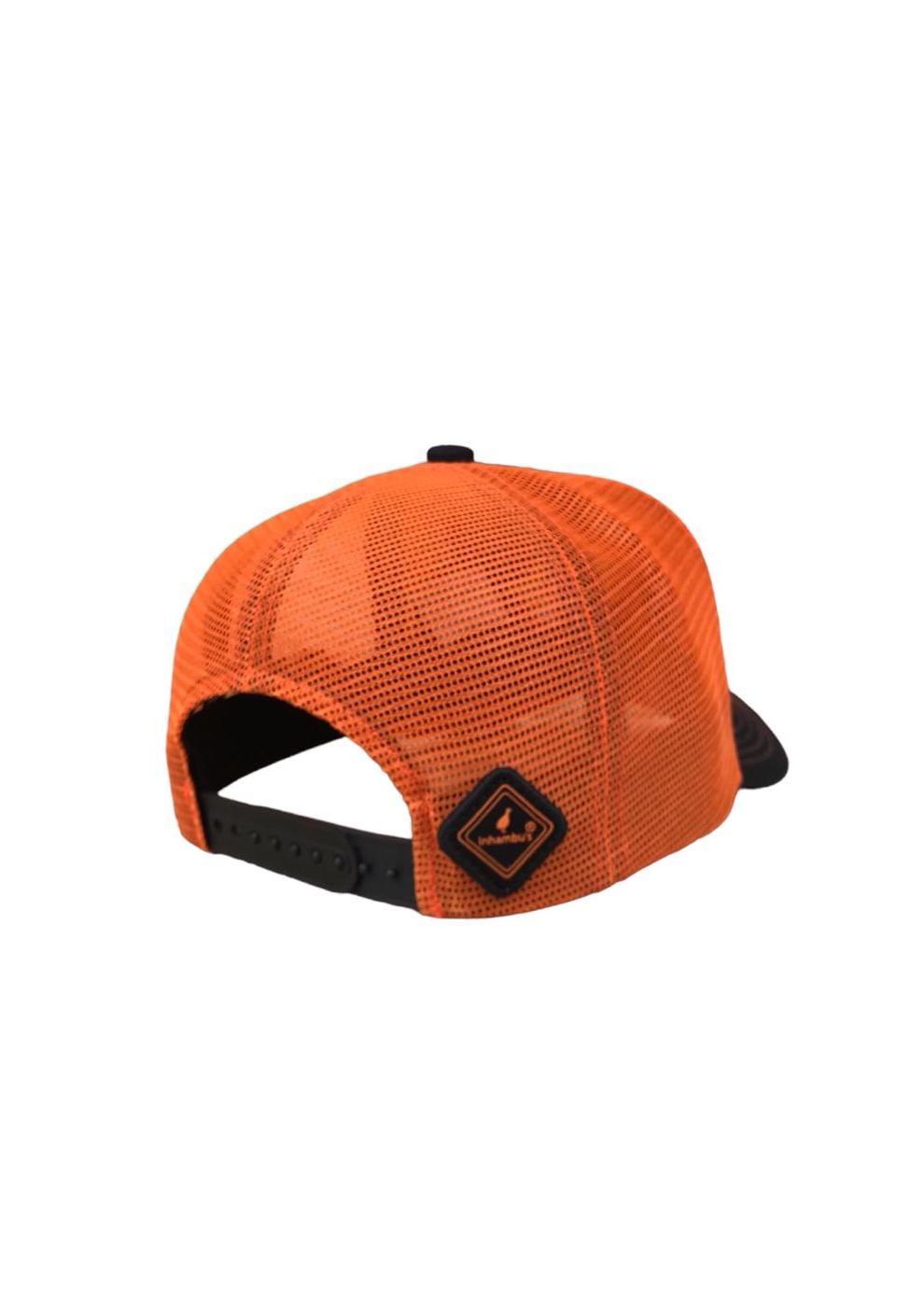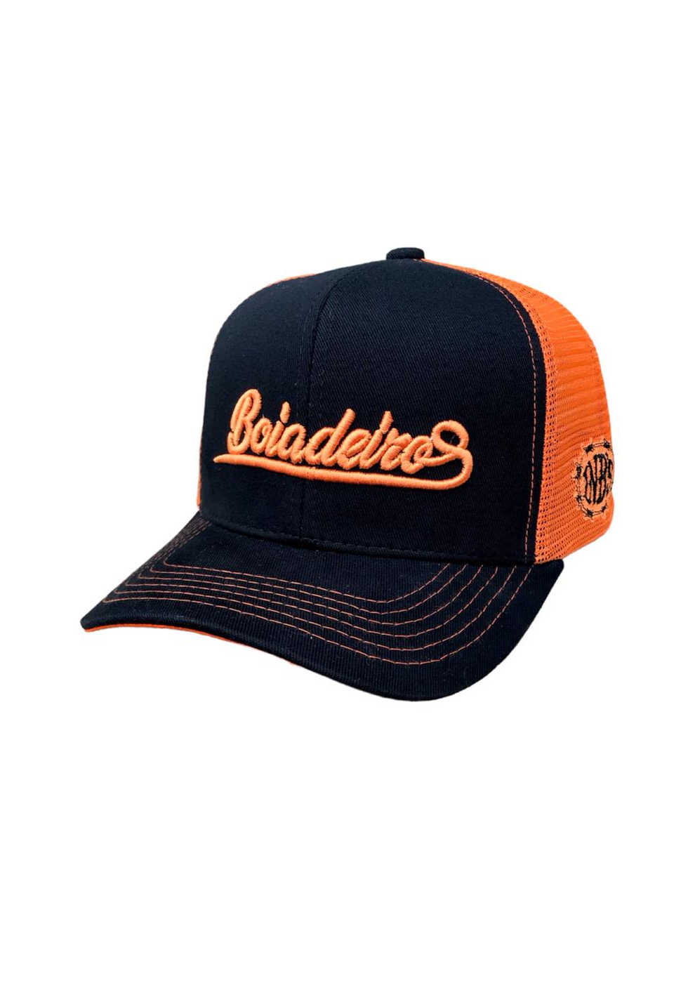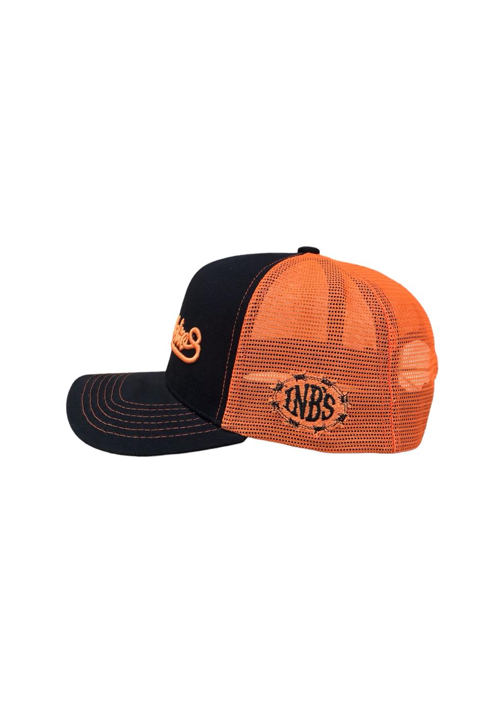 BONÉ INHAMBU'S ESTILO SEIS GOMOS COM FRENTE EM SARJA NA COR PRETO ABA NA COR PRETO SUPERIOR E LARANJA INFERIOR, VIÉS PERSONALIZADO, FORRO PERSONALIZADO,ESPELHAMENTO INTERNO, ABA COM 6 COSTURAS, TELA NA COR LARANJA, CARNEIRA LARGA, ENTRETELA DE MEMORIA, REGULADOR PLÁSTICO, BORDADO FRONTAL LARANJA EM ALTO RELEVO, BORDADO LATERAL E APLIQUE TRASEIRO EM PATCH E SILK ALTO RELEVO.