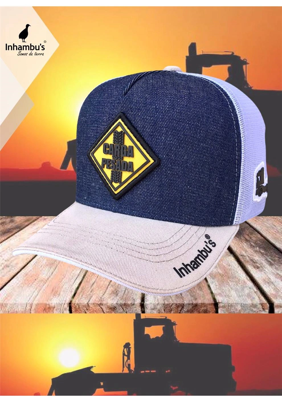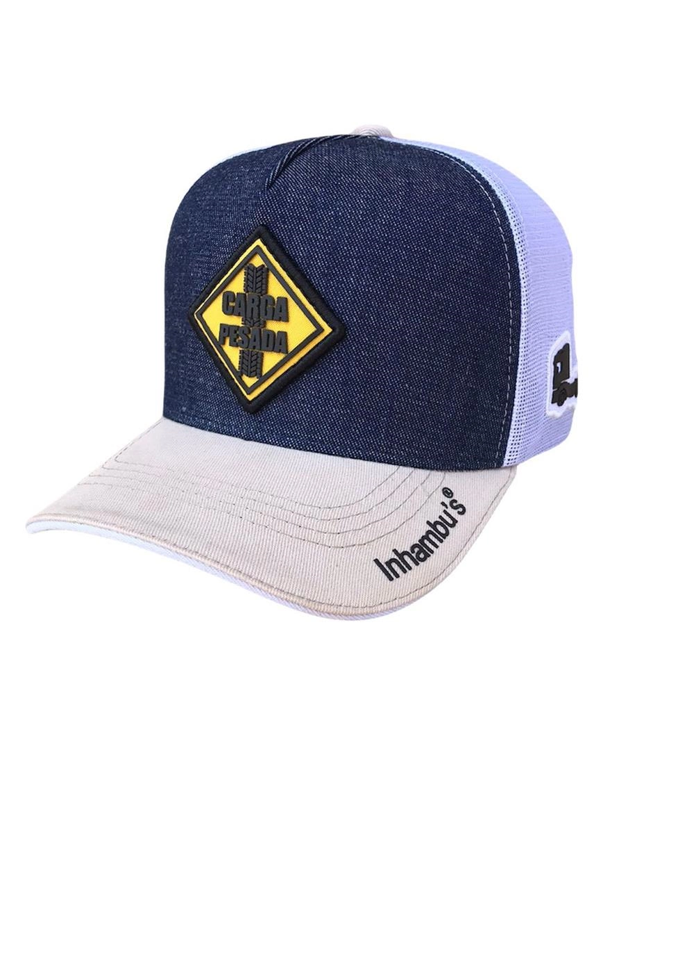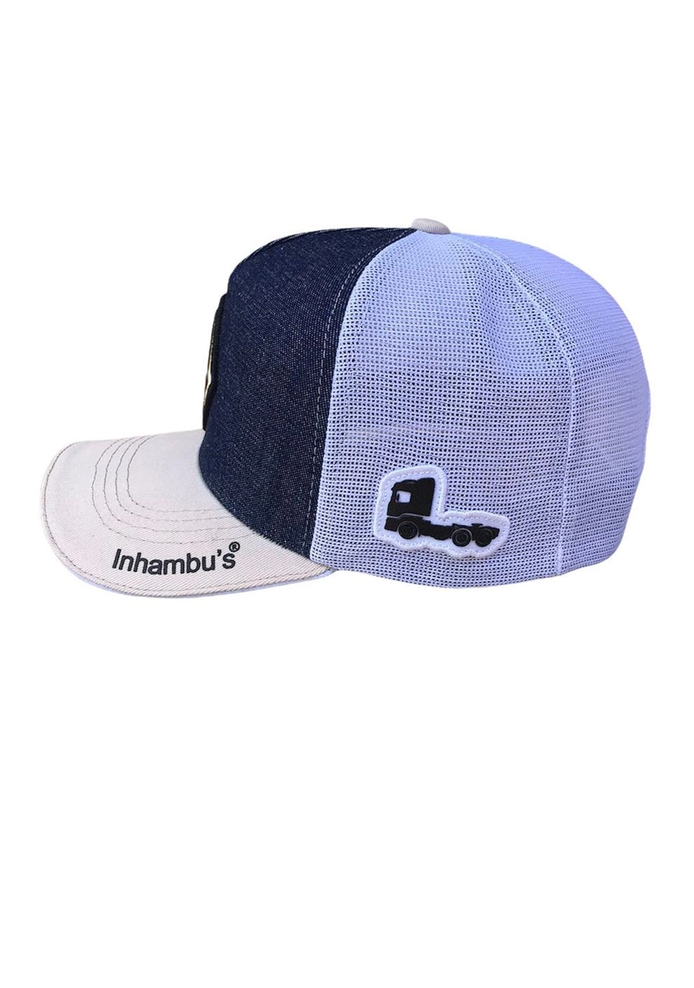 BONÉ INHAMBU'S ABA CURVA ESTILO TRUCKER EM SARJA NA COR AZUL JEANS, VIÉS PERSONALIZADO, ESPELHAMENTO INTERNO, ABA COM 4 COSTURAS BEGE + SANDUÍCHE NA COR BRANCO, TELA NA COR CINZA BRANCO, CARNEIRA LARGA, ENTRETELA DE MEMÓRIA, REGULADOR PLÁSTICO, APLIQUE EM PATCH EM SILK ALTO RELEVO FRONTAL, APLIQUE EM PATCH SILKADO LATERAL E APLIQUE TRASEIRO EM PATCH SILKADO.