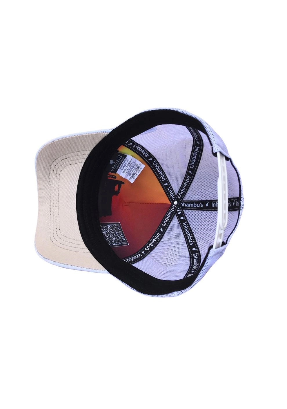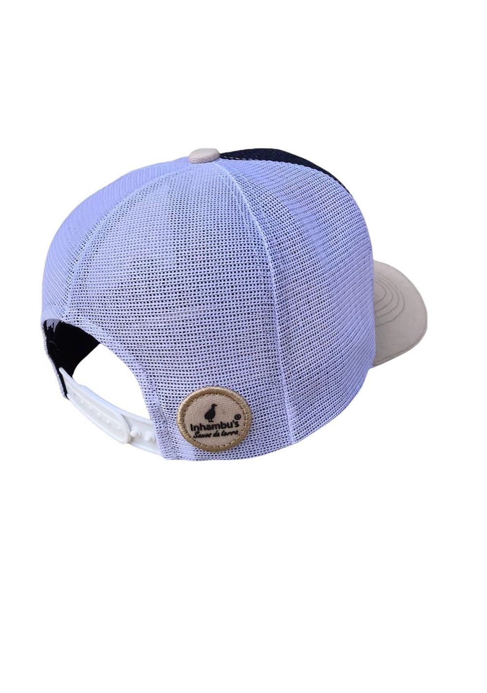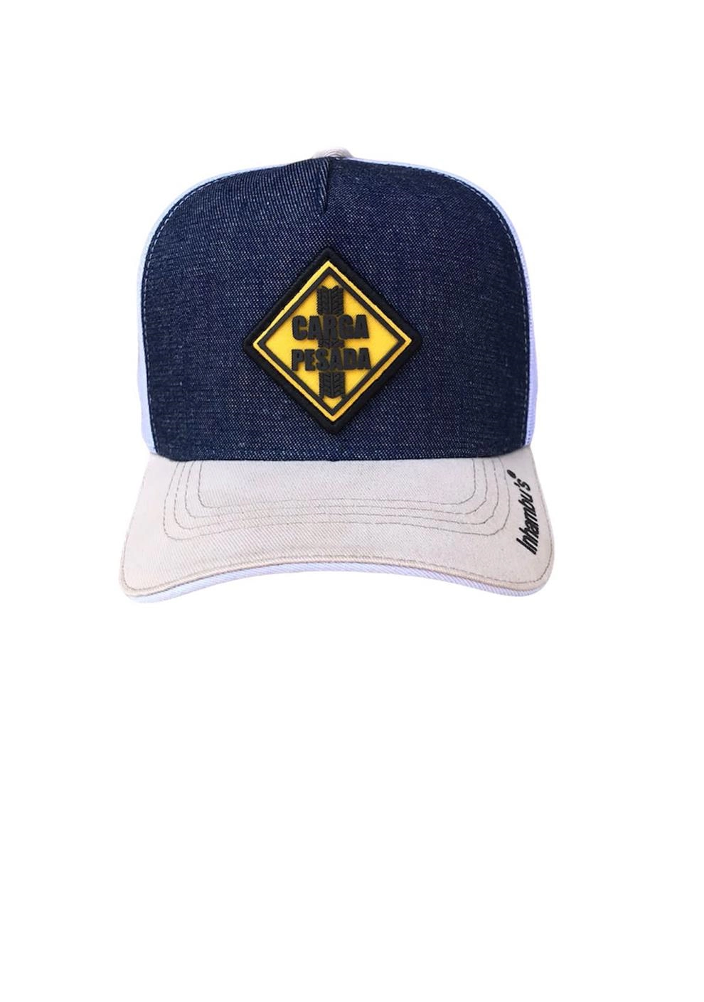 BONÉ INHAMBU'S ABA CURVA ESTILO TRUCKER EM SARJA NA COR AZUL JEANS, VIÉS PERSONALIZADO, ESPELHAMENTO INTERNO, ABA COM 4 COSTURAS BEGE + SANDUÍCHE NA COR BRANCO, TELA NA COR CINZA BRANCO, CARNEIRA LARGA, ENTRETELA DE MEMÓRIA, REGULADOR PLÁSTICO, APLIQUE EM PATCH EM SILK ALTO RELEVO FRONTAL, APLIQUE EM PATCH SILKADO LATERAL E APLIQUE TRASEIRO EM PATCH SILKADO.