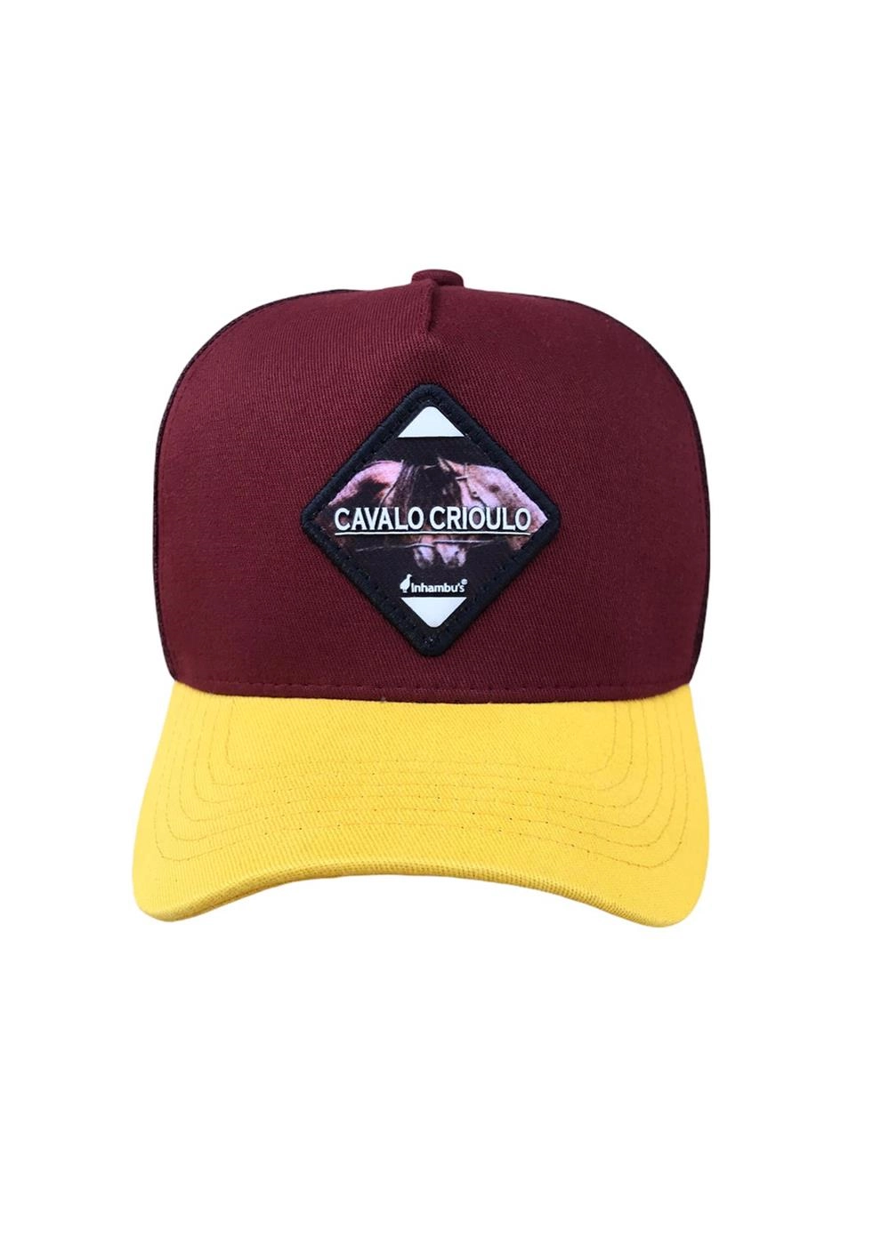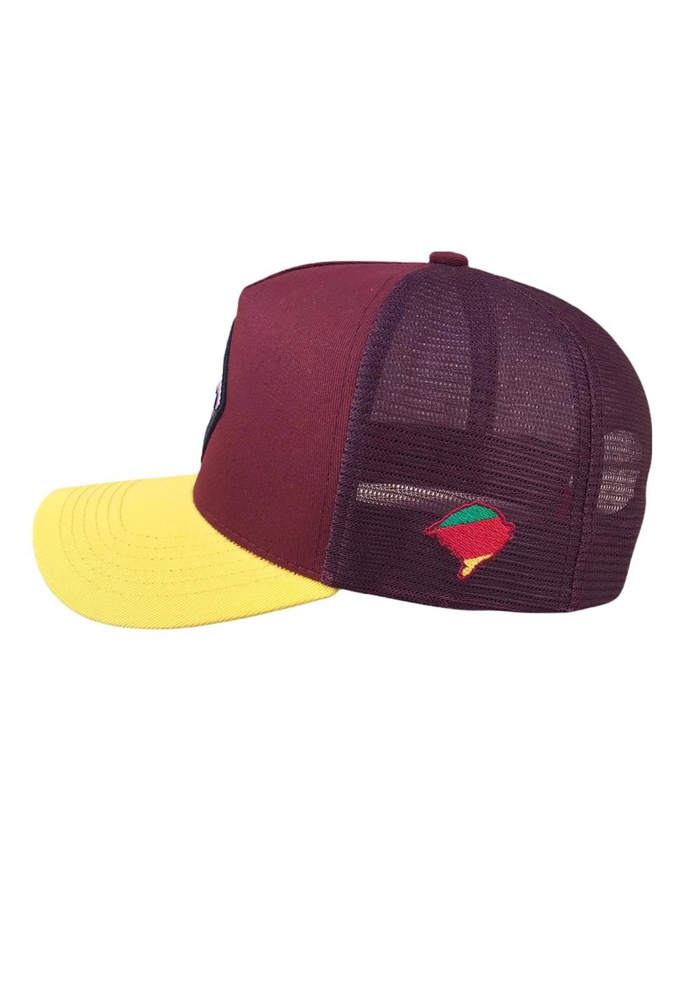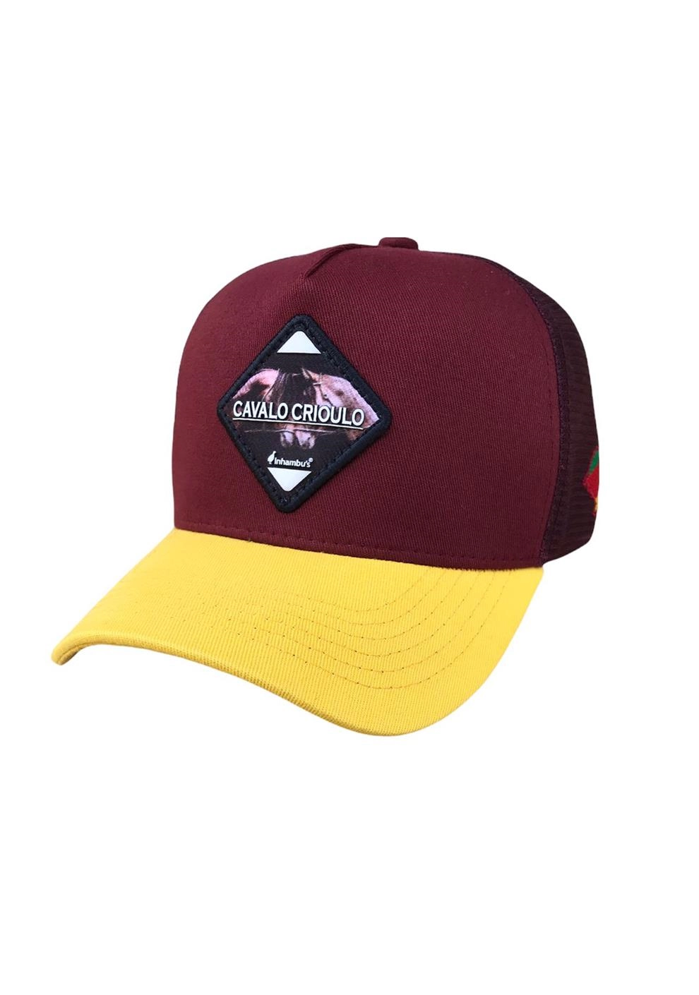 BONÉ INHAMBU'S ESTILO TRUCKER EM SARJA NA COR GRENÁ, VIÉS PERSONALIZADO, ESPELHAMENTO INTERNO, ABA COM 6 COSTURAS NA COR AMARELO, TELA NA COR GRENÁ , CARNEIRA LARGA, ENTRETELA DE MEMÓRIA, REGULADOR PLÁSTICO, APLIQUE FRONTAL EM PATCH SUBLIMADO E SILK ALTO RELEVO, BORDADO LATERAL, APLIQUE TRASEIRO LOGO.
