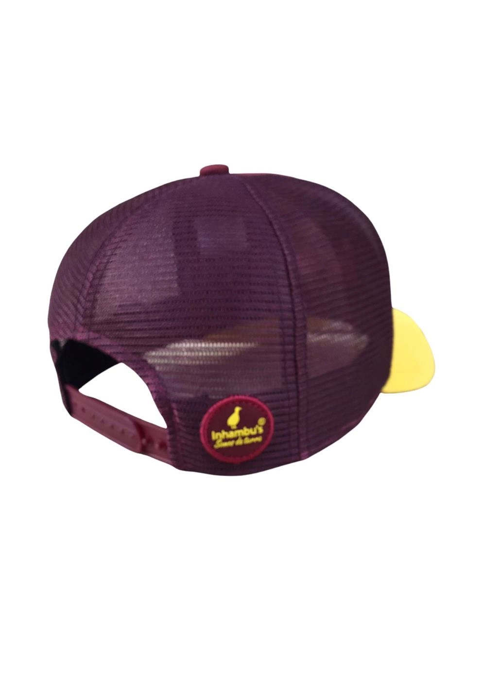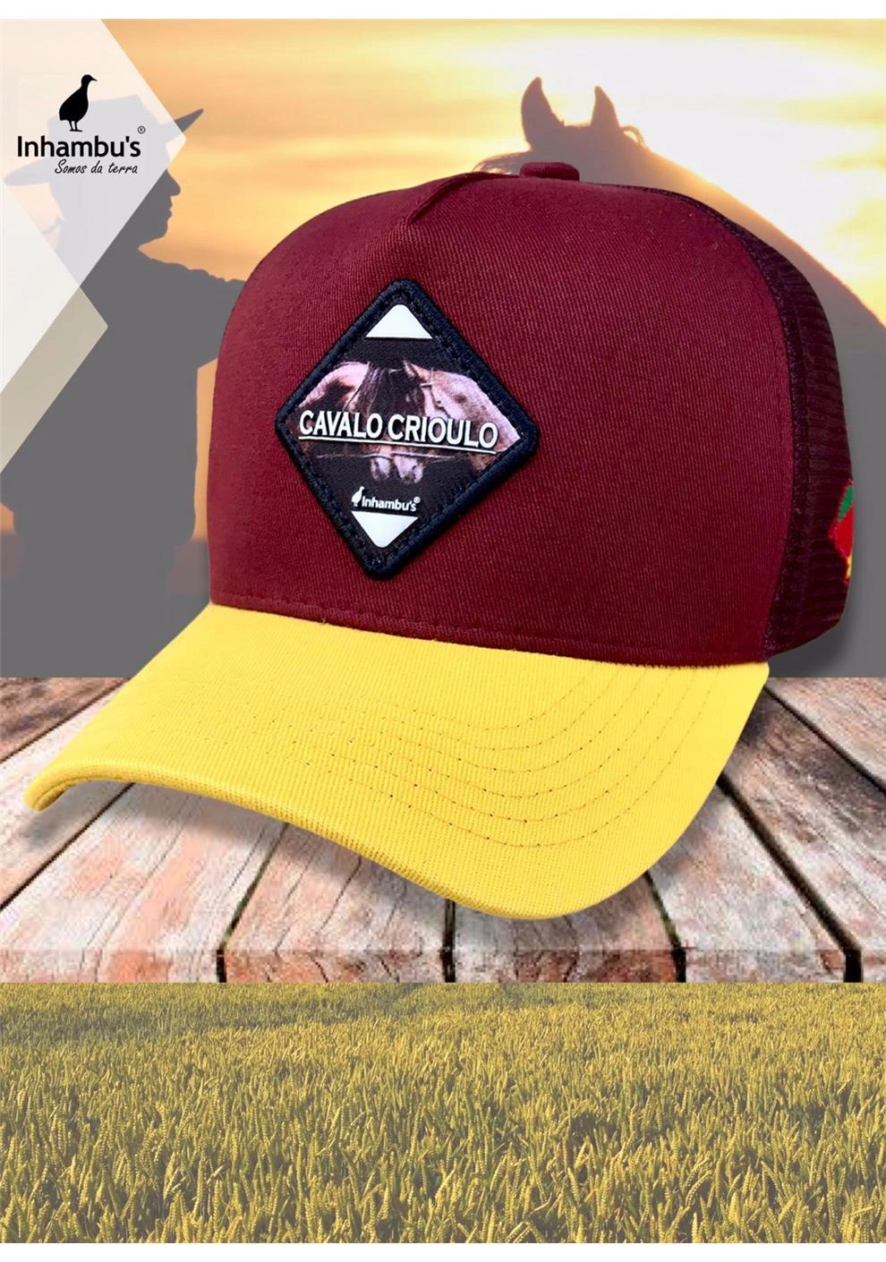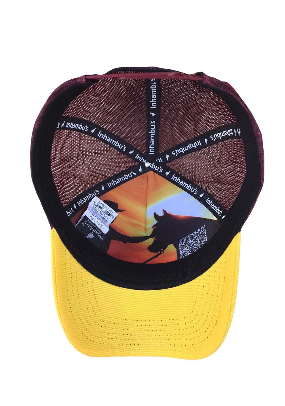 BONÉ INHAMBU'S ESTILO TRUCKER EM SARJA NA COR GRENÁ, VIÉS PERSONALIZADO, ESPELHAMENTO INTERNO, ABA COM 6 COSTURAS NA COR AMARELO, TELA NA COR GRENÁ , CARNEIRA LARGA, ENTRETELA DE MEMÓRIA, REGULADOR PLÁSTICO, APLIQUE FRONTAL EM PATCH SUBLIMADO E SILK ALTO RELEVO, BORDADO LATERAL, APLIQUE TRASEIRO LOGO.
