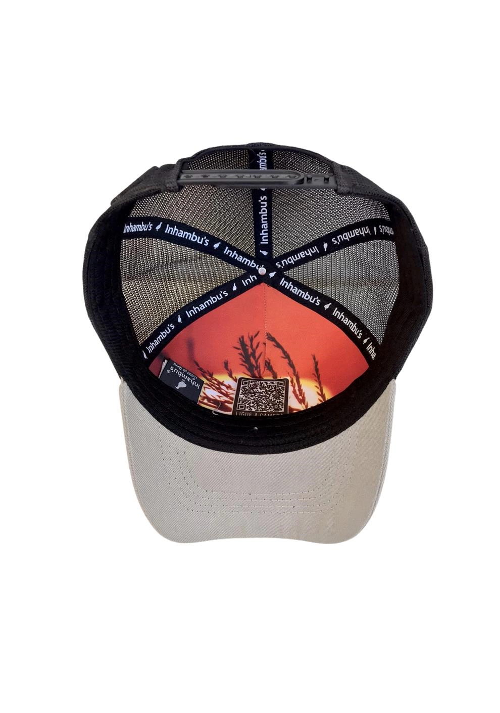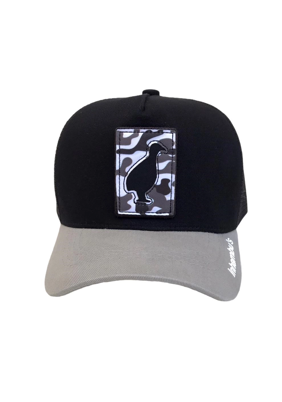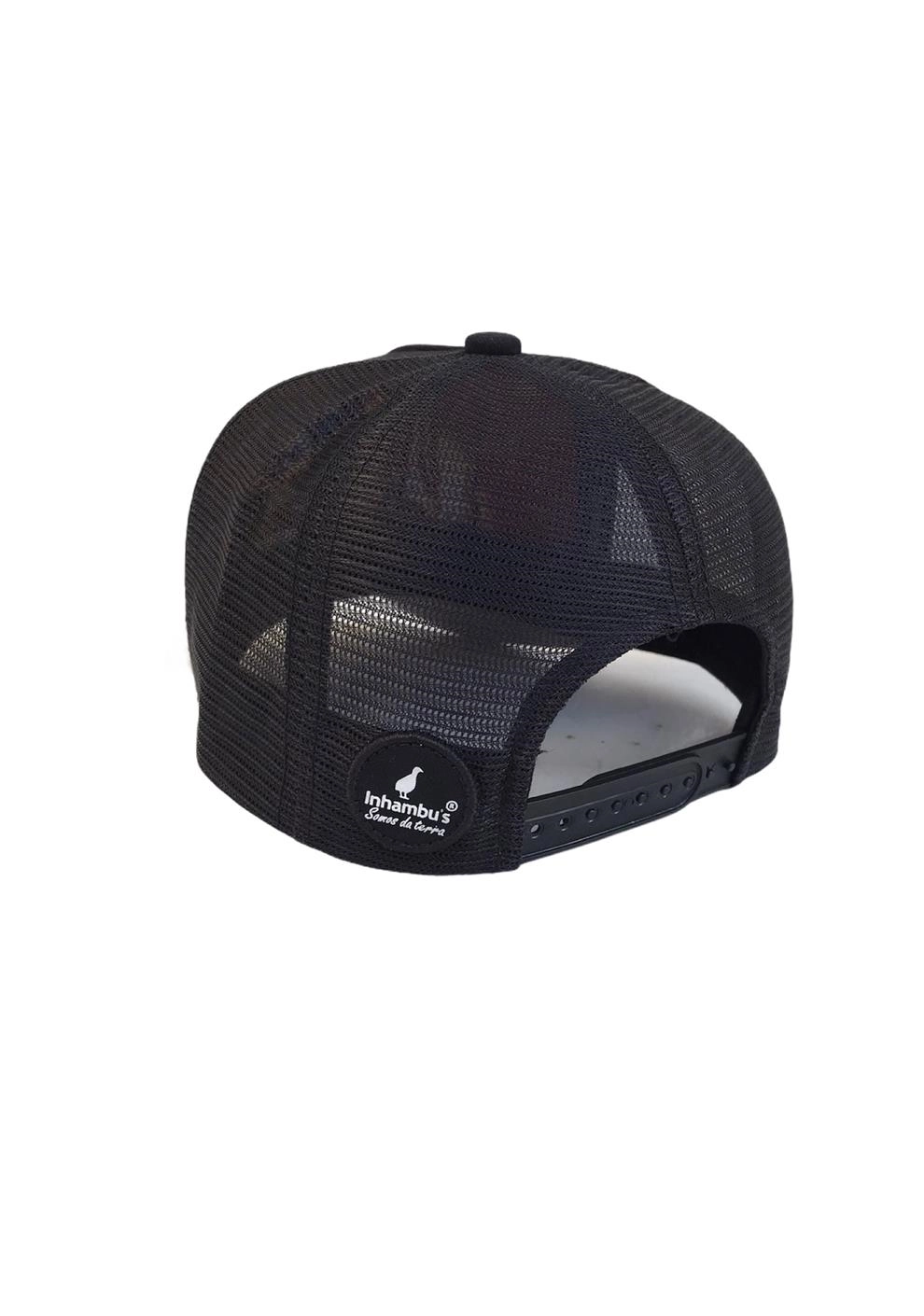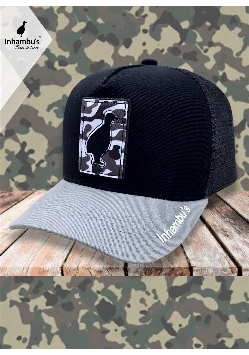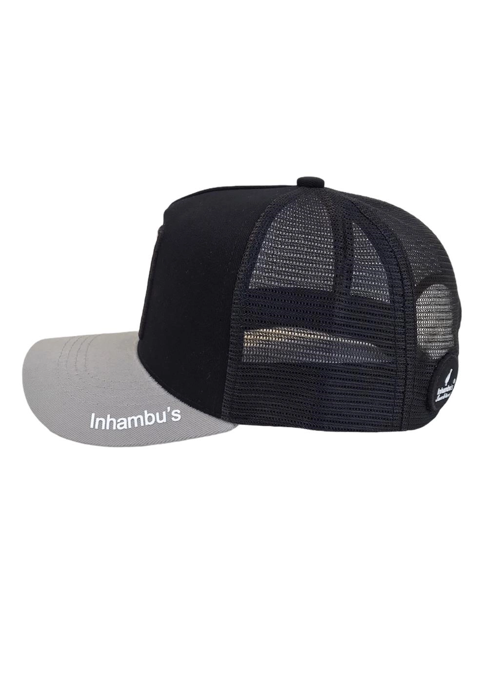 BONÉ INHAMBU'S ESTILO TRUCKER COM FRENTE EM SARJA NA COR PRETO E ABA CINZA, FORRO PERSONALIZADO, ESPELHAMENTO INTERNO, ABA COM 6 COSTURAS, TELA NA COR PRETO, CARNEIRA LARGA, FORRO PERSONALIZADO, ENTRETELA DE MEMORIA, REGULADOR PLÁSTICO, APLIQUE FRONTAL PACTH SUBLIMADO EM POLIESTER, CORTE A LASER, APLIQUE TRASEIRO EM PATCH E SILK ALTO RELEVO,