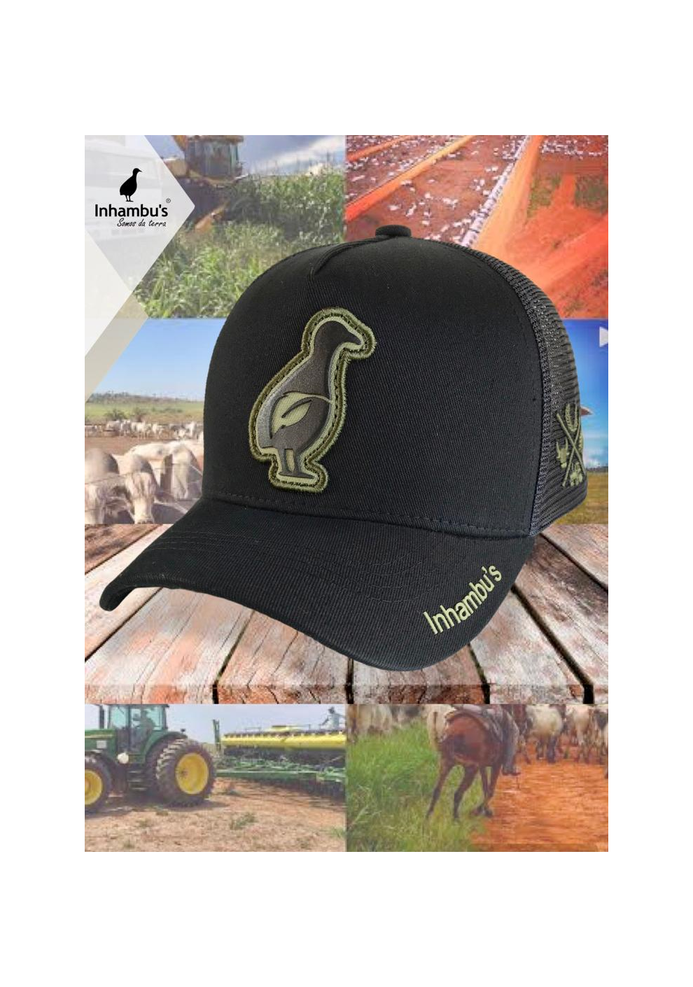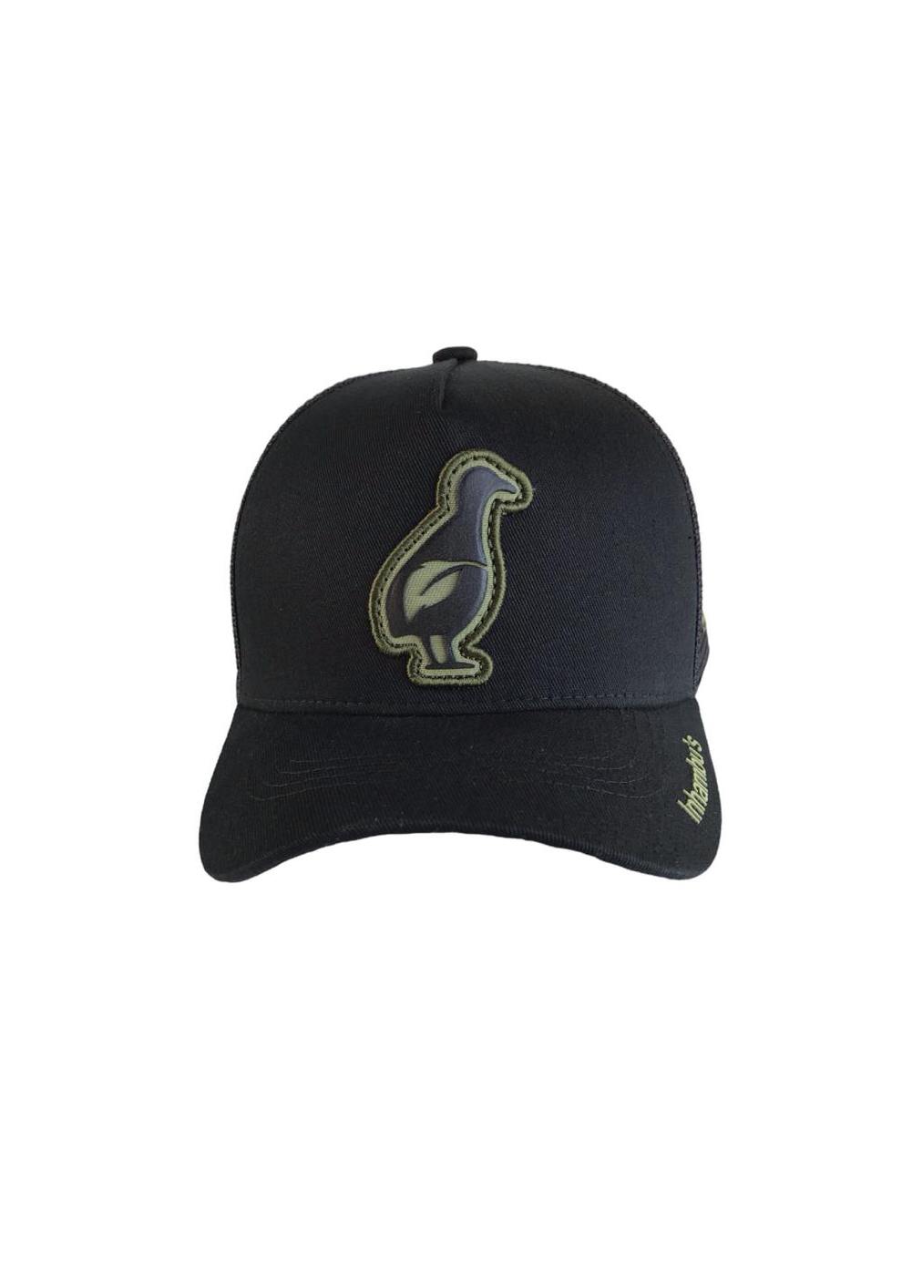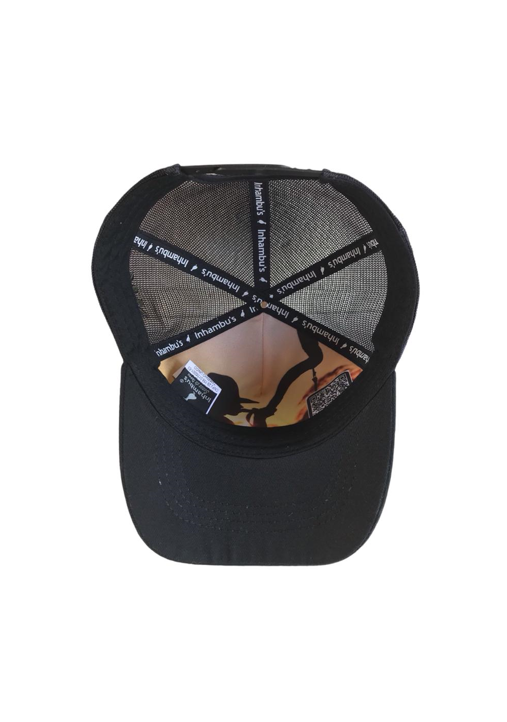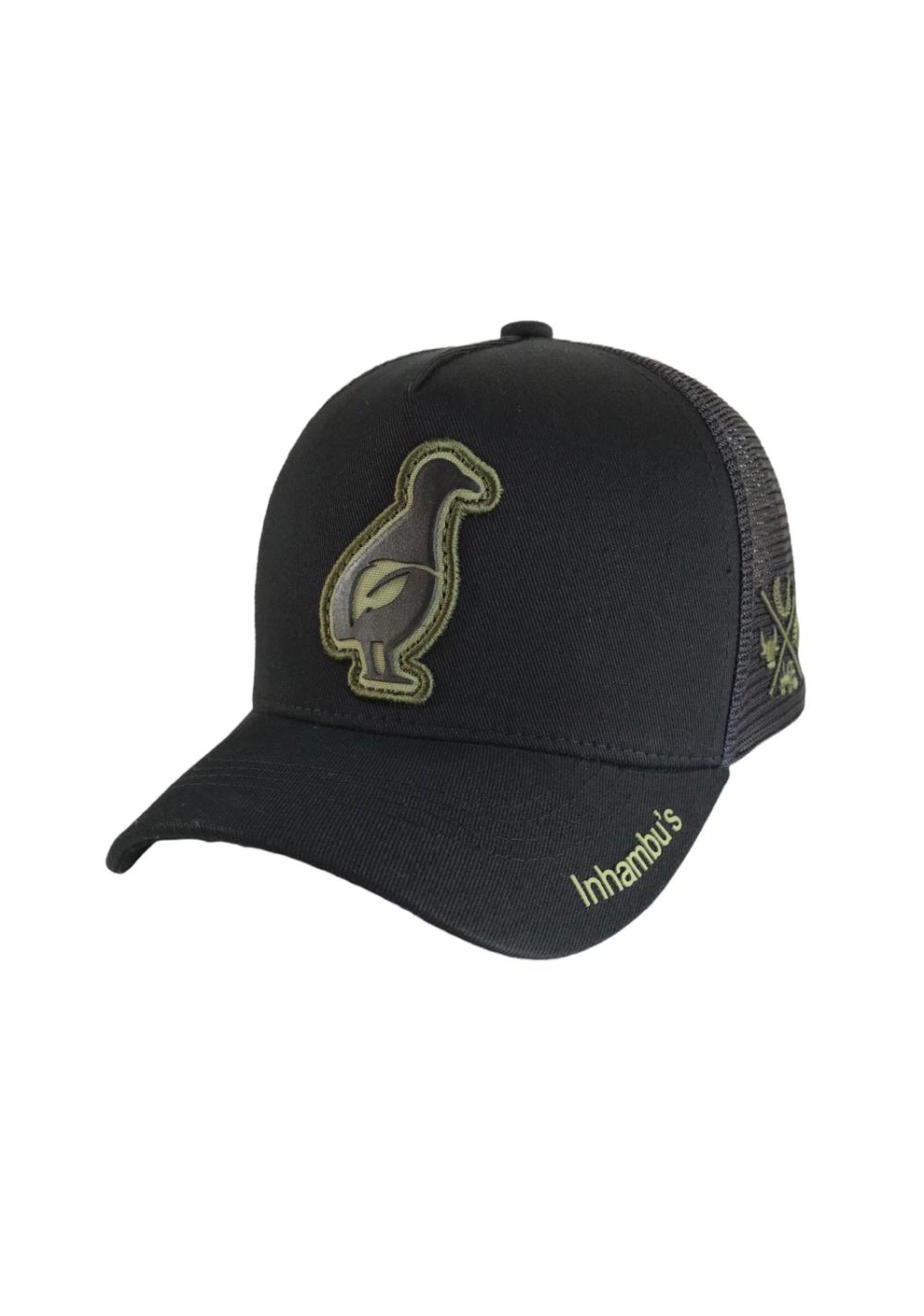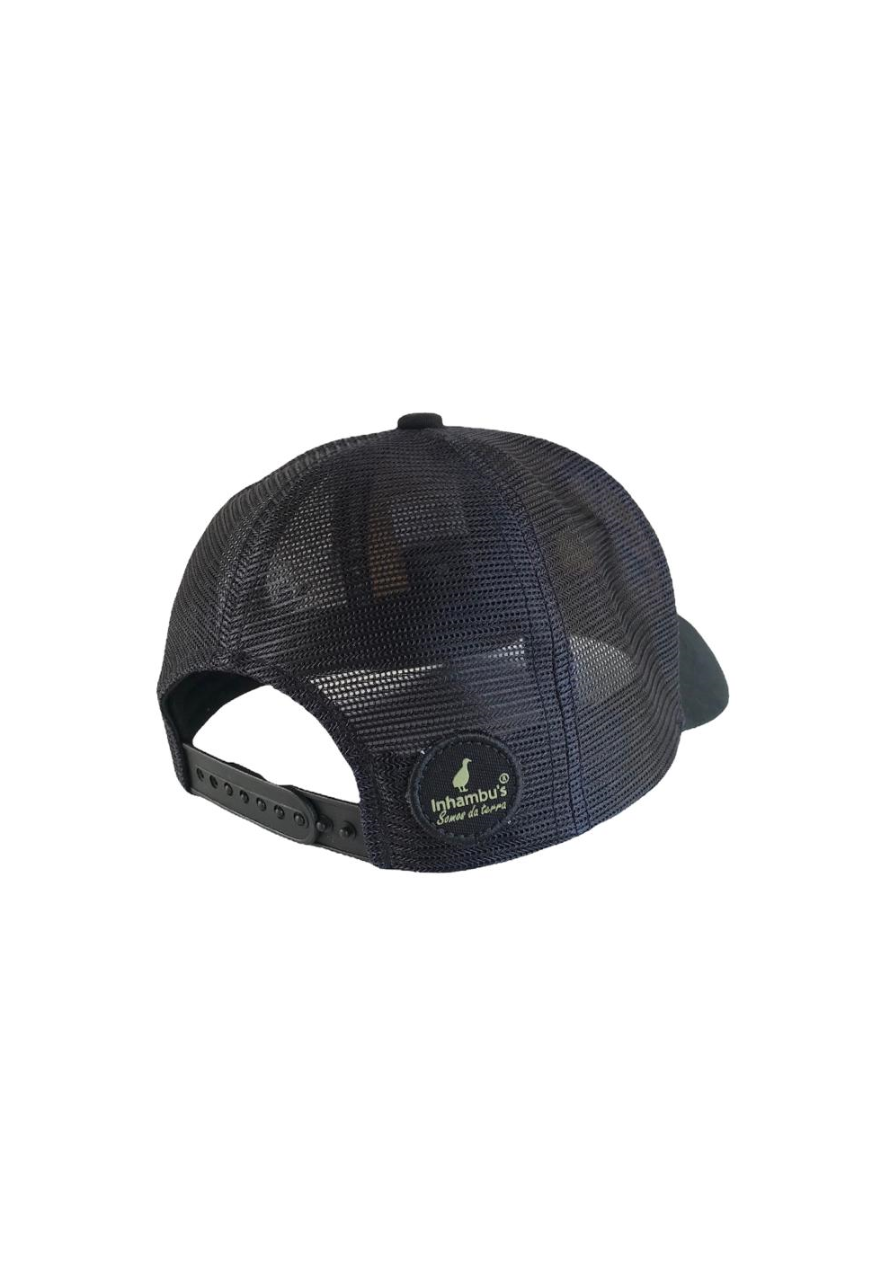 BONÉ INHAMBU'S ESTILO TRUCKER COM FRENTE EM SARJA NA COR PRETO ABA NA COR PRETO, VIÉS PERSONALIZADO, FORRO PERSONALIZADO,ESPELHAMENTO INTERNO, ABA COM 4 COSTURAS, TELA NA COR PRETO, CARNEIRA LARGA, ENTRETELA DE MEMORIA, REGULADOR PLÁSTICO, APLIQUE FRONTAL EM PATCH NA COR VERDE COM SILK ALTO RELEVO PRETO, BORDADO LATERAL E APLIQUE TRASEIRO EM PATCH E SILK ALTO RELEVO.