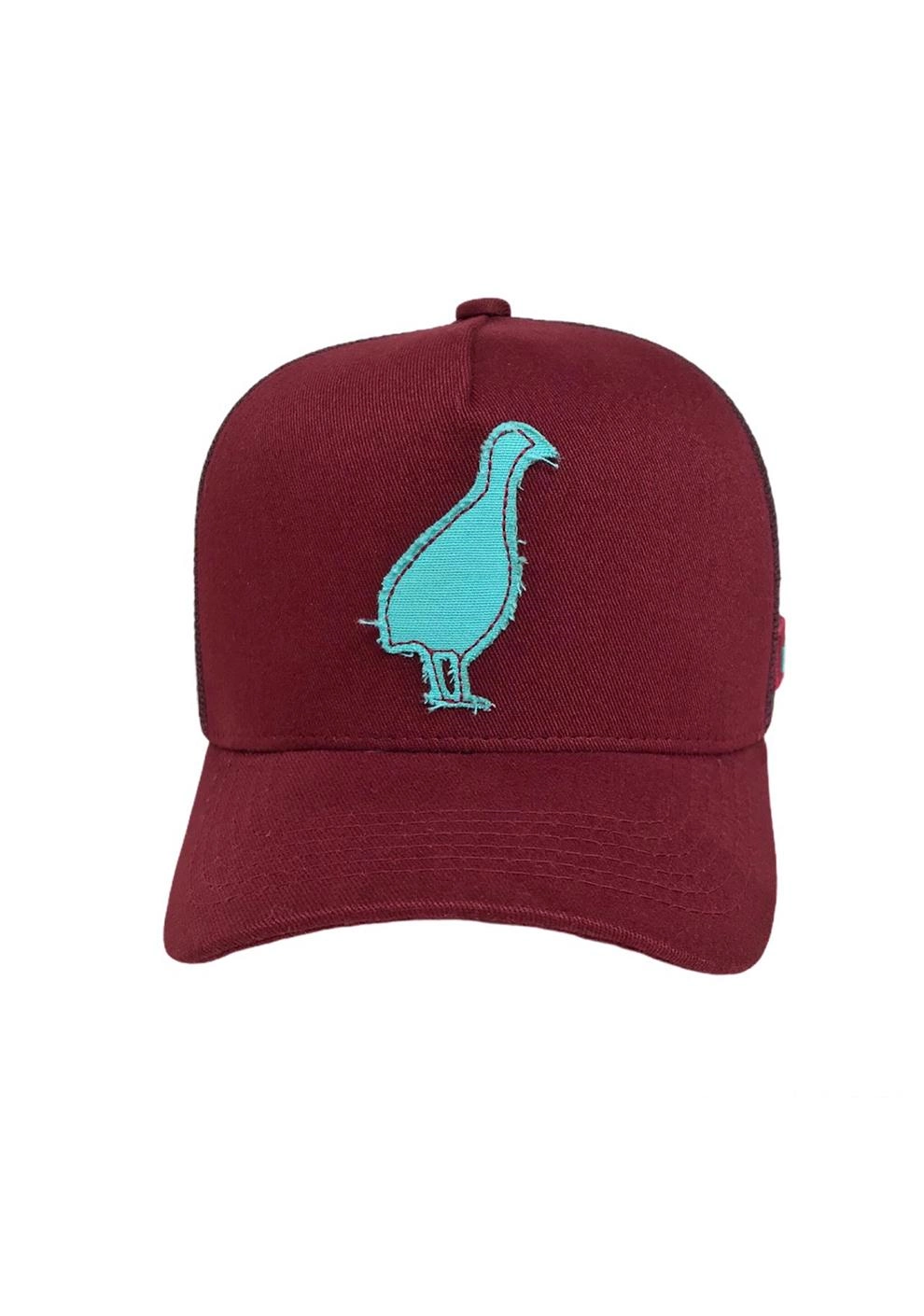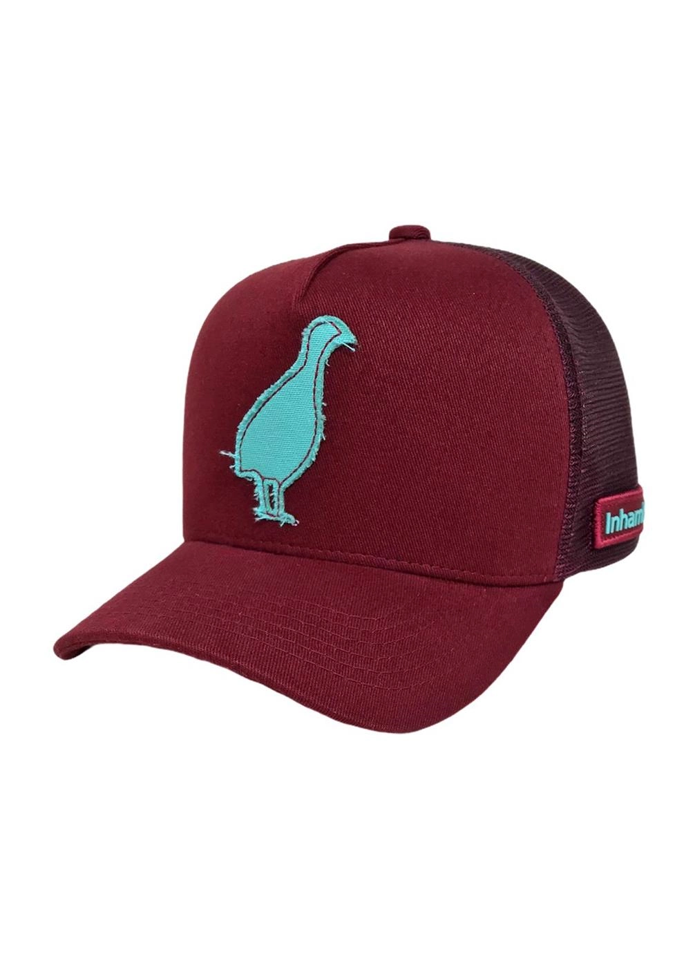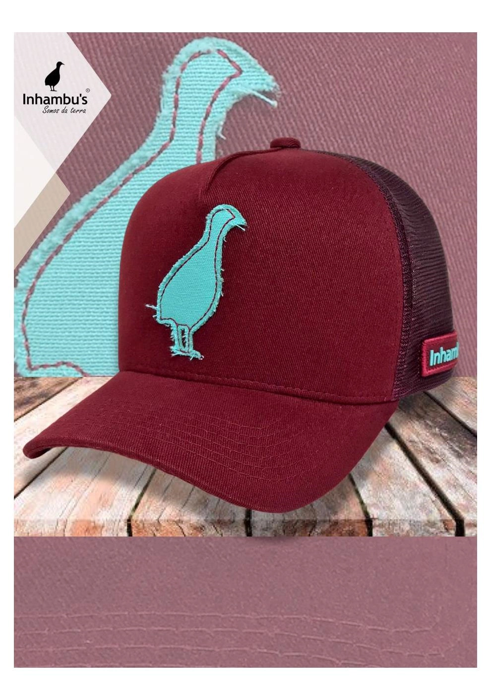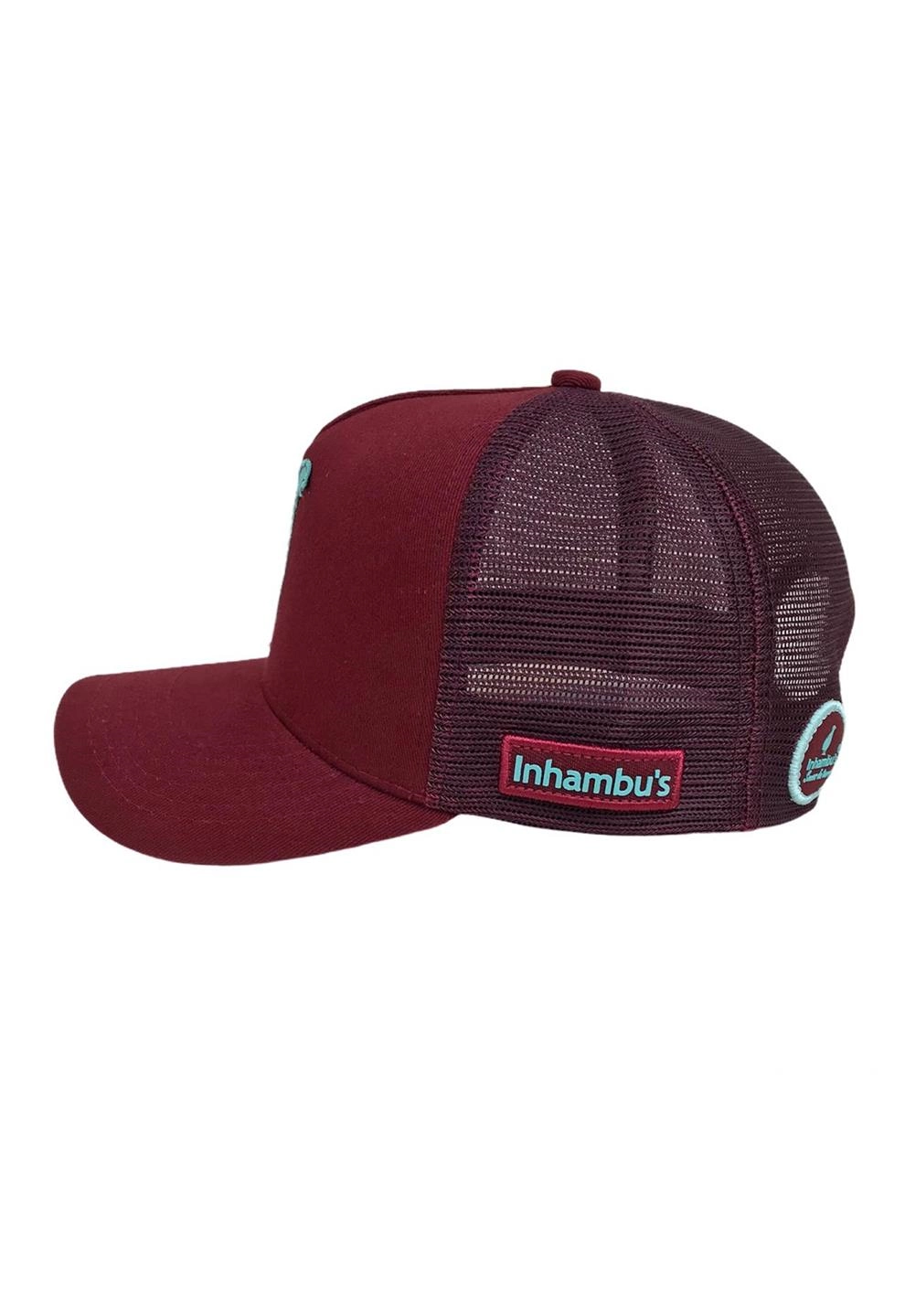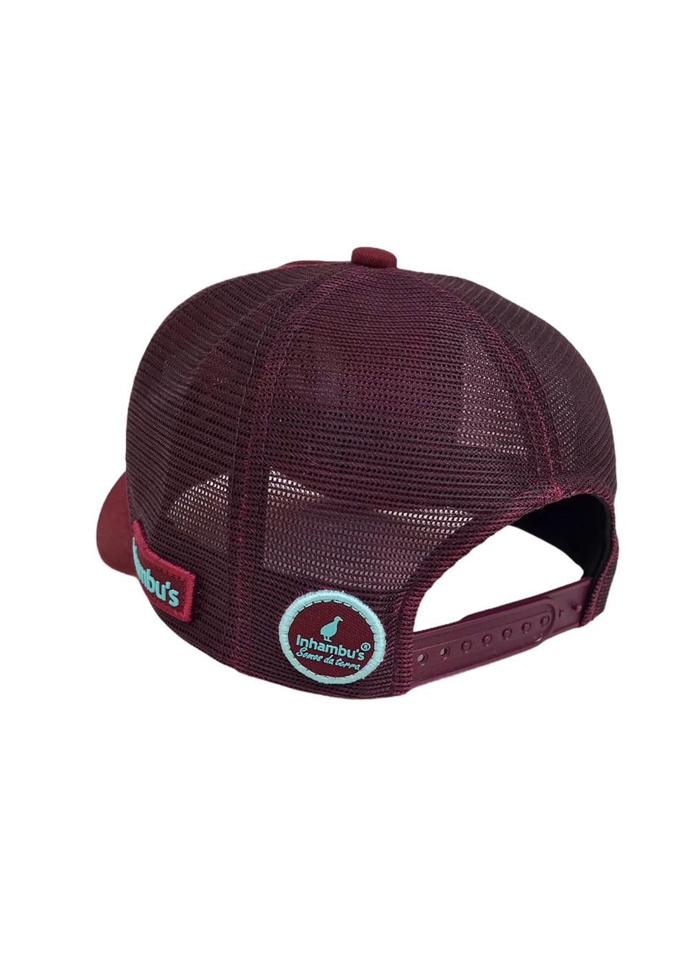 BONÉ INHAMBU'S ESTILO TRUCKER COM FRENTE EM SARJA NA COR GRENÁ , FORRO PERSONALIZADO, ESPELHAMENTO INTERNO, ABA COM 6 COSTURAS, TELA NA COR VINHO, CARNEIRA LARGA, FORRO PERSONALIZADO, ENTRETELA DE MEMORIA, REGULADOR PLÁSTICO, APLIQUE FRONTAL COSTURADO EM TECIDO RECORTADO A LASER, APLIQUE TRASEIRO EM PATCH E SILK ALTO RELEVO, APLIQUE LATERAL EM PACTH E SILK ALTO RELEVO.