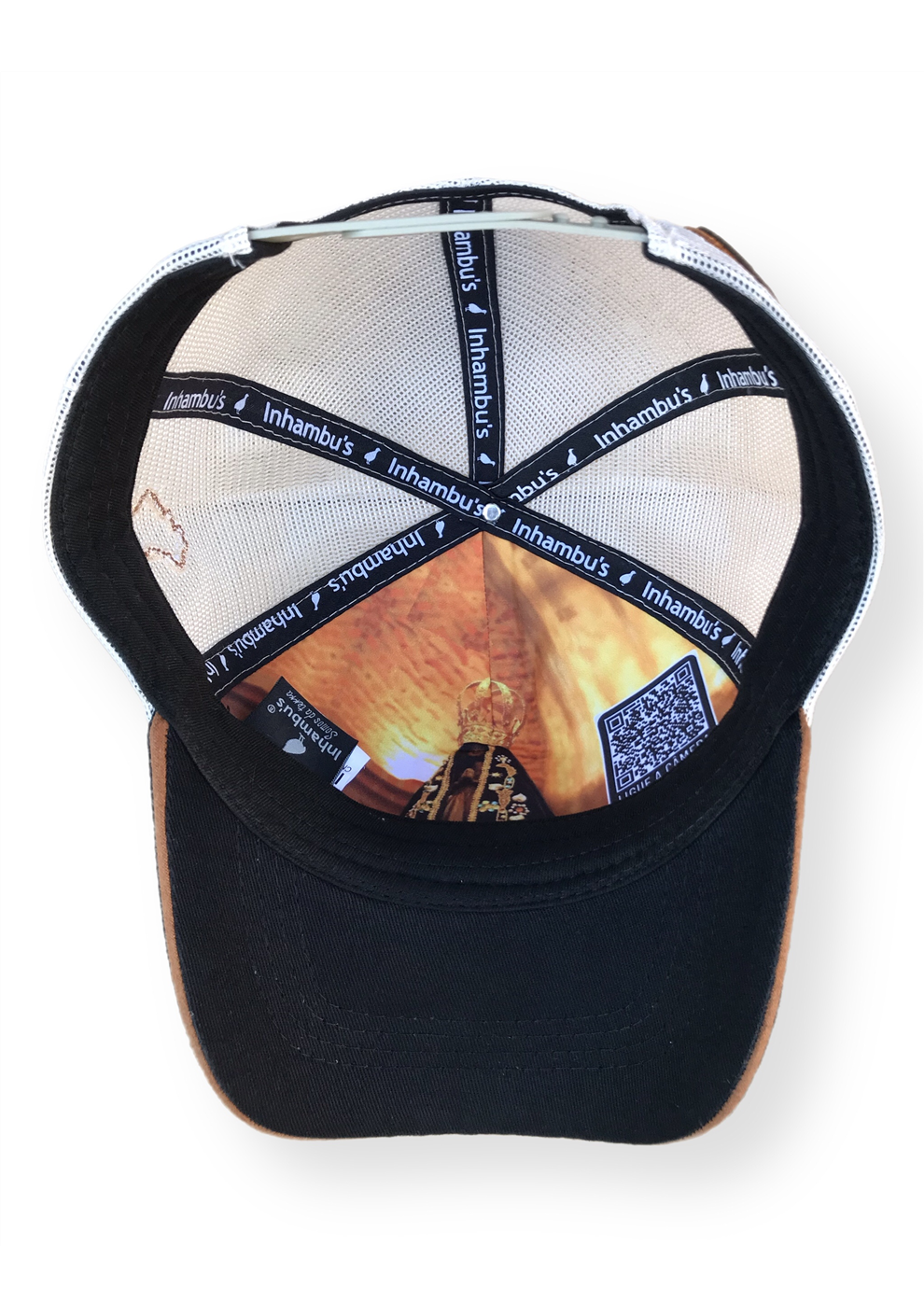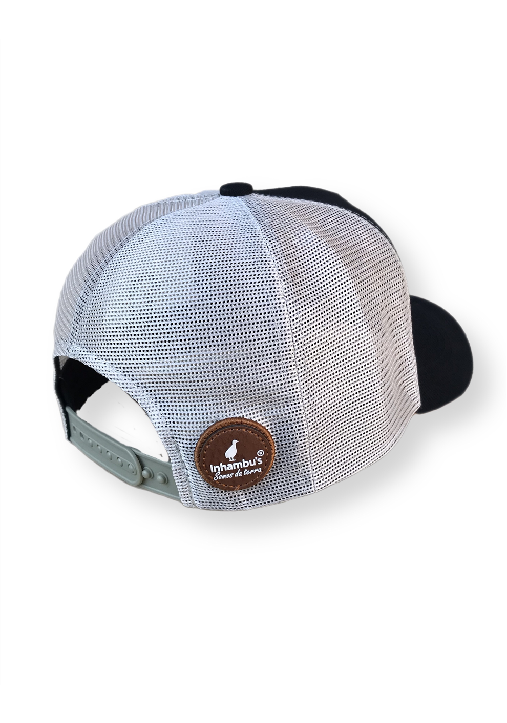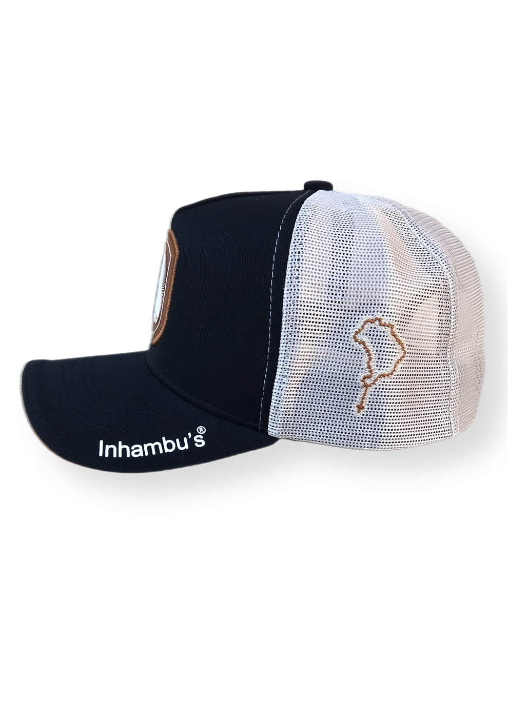 BONÉ INHAMBU'S ESTILO TRUCKER COM FRENTE EM SARJA NA COR PRETO, VIÉS PERSONALIZADO, FORRO PERSONALIZADO,ESPELHAMENTO INTERNO, ABA COM 4 COSTURAS NA COR PRETO, TELA NA COR BEGE, CARNEIRA LARGA, FORRO PERSONALIZADO, ENTRETELA DE MEMORIA, REGULADOR PLÁSTICO, APLIQUE FRONTAL EM PATCH COM SILK ALTO RELEVO BRANCO, BORDADO LATERAL E APLIQUE TRASEIRO EM PATCH E SILK ALTO RELEVO.