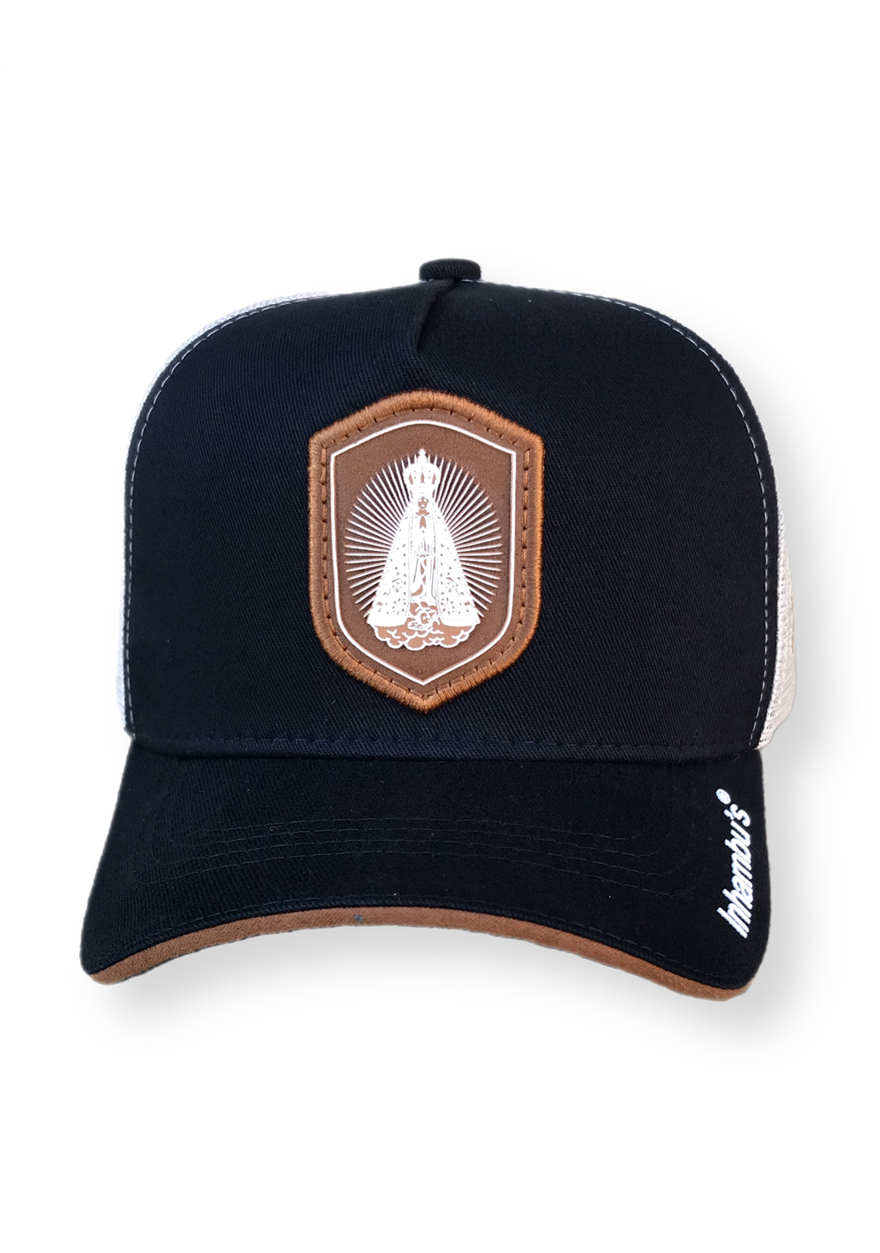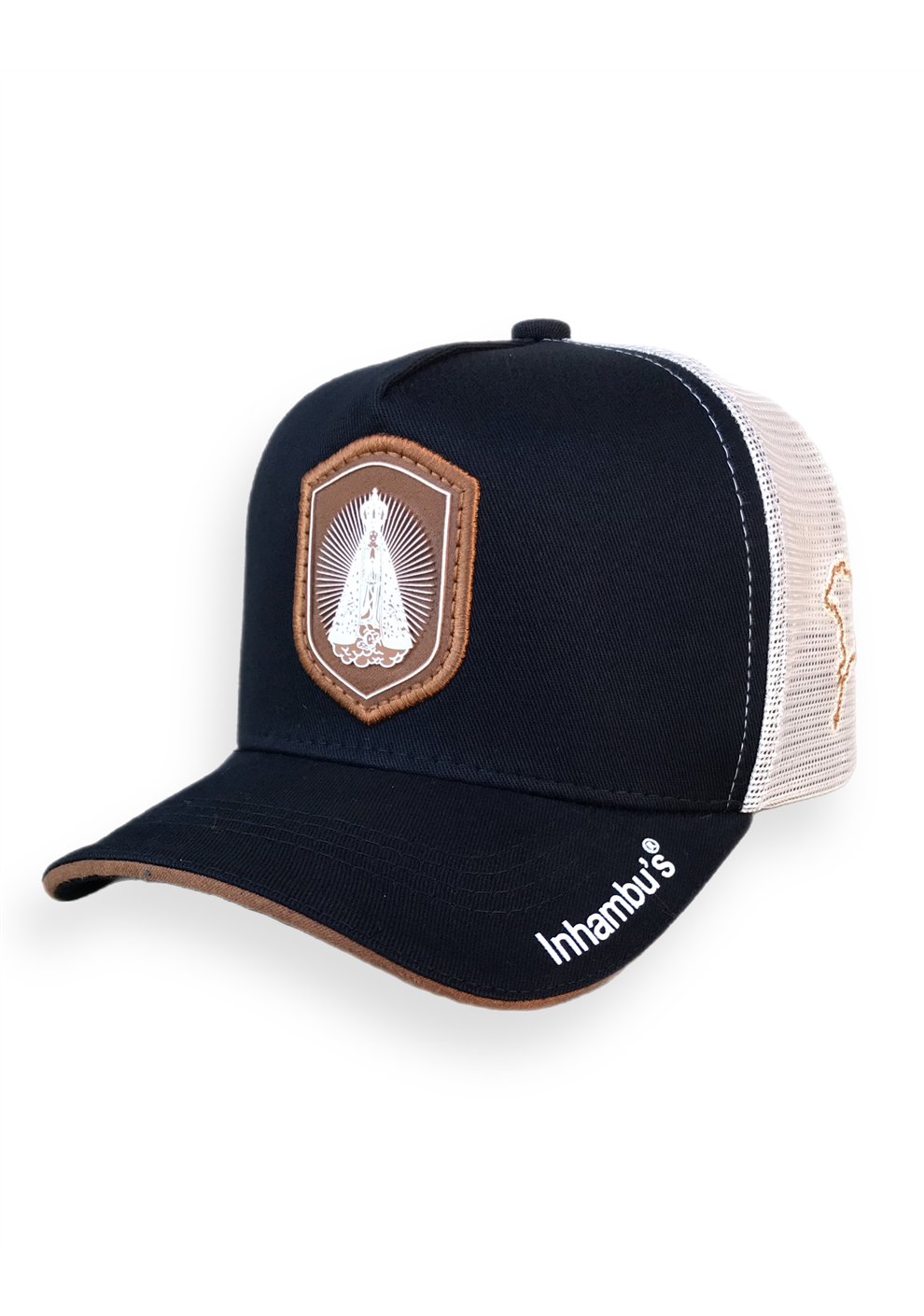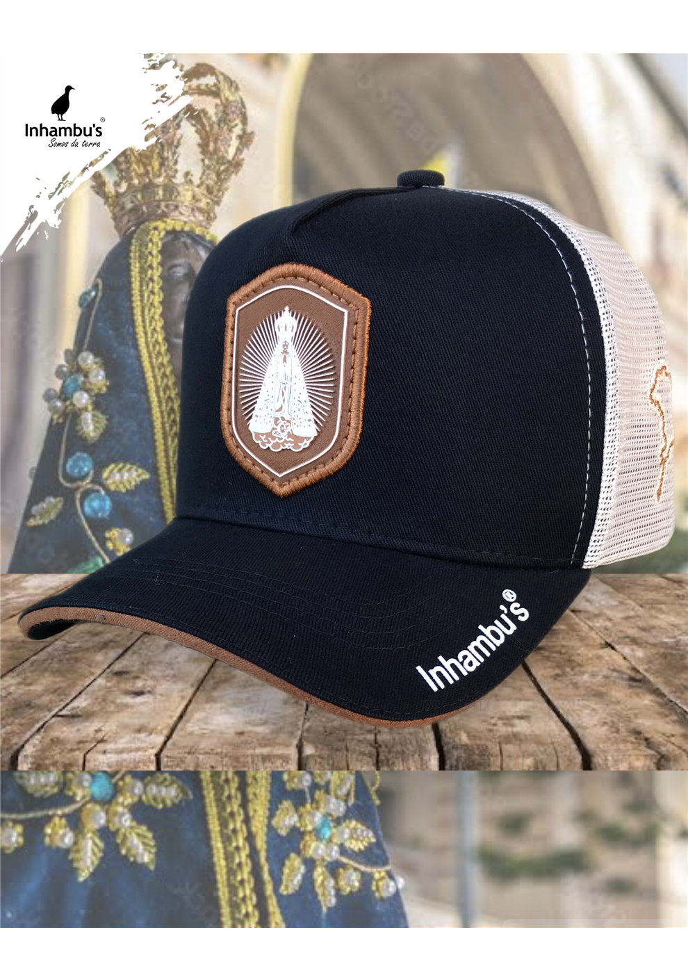 BONÉ INHAMBU'S ESTILO TRUCKER COM FRENTE EM SARJA NA COR PRETO, VIÉS PERSONALIZADO, FORRO PERSONALIZADO,ESPELHAMENTO INTERNO, ABA COM 4 COSTURAS NA COR PRETO, TELA NA COR BEGE, CARNEIRA LARGA, FORRO PERSONALIZADO, ENTRETELA DE MEMORIA, REGULADOR PLÁSTICO, APLIQUE FRONTAL EM PATCH COM SILK ALTO RELEVO BRANCO, BORDADO LATERAL E APLIQUE TRASEIRO EM PATCH E SILK ALTO RELEVO.
