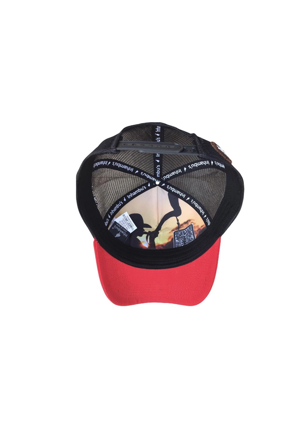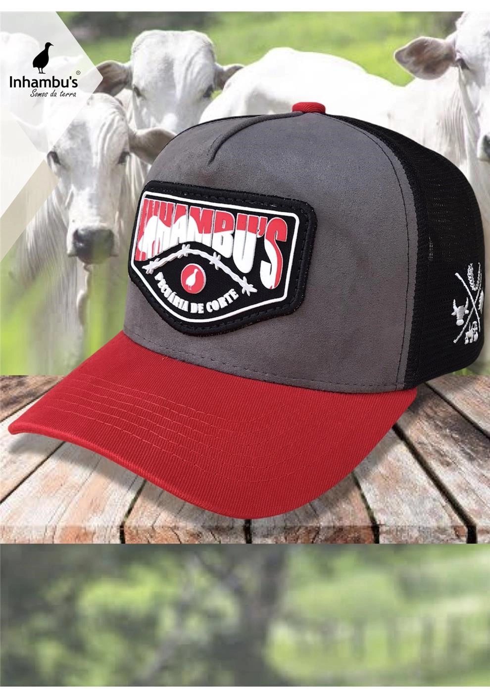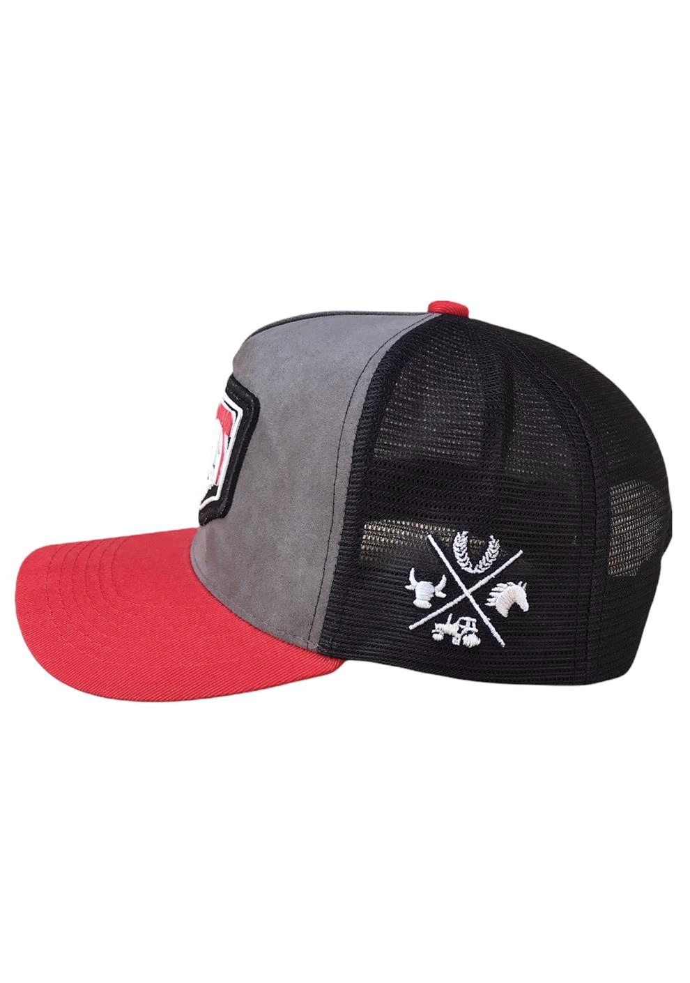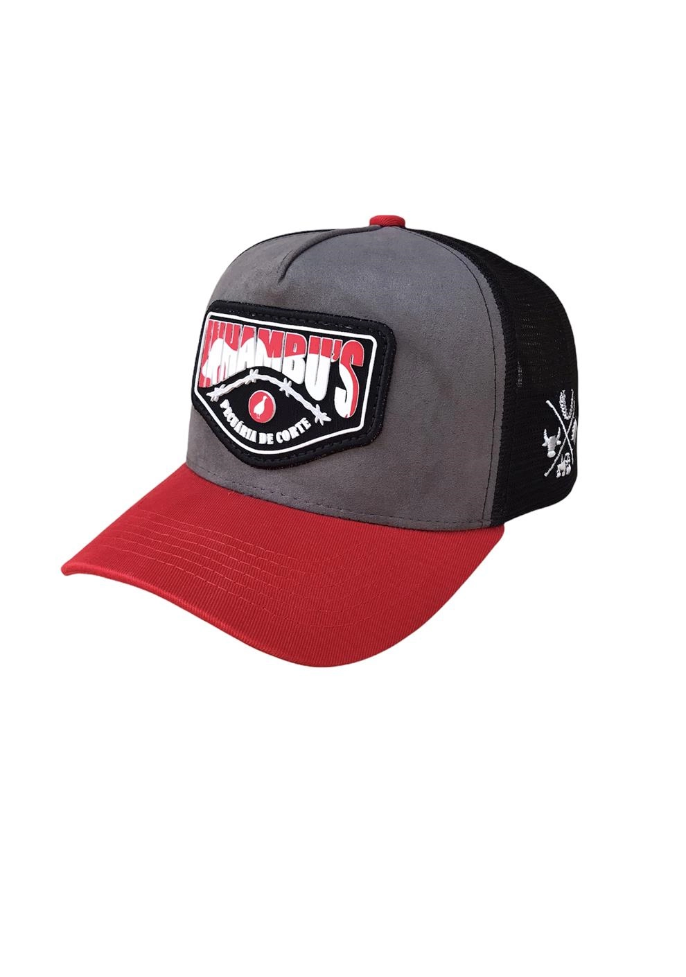 BONÉ INHAMBU'S ESTILO TRUCKER EM CAMURÇA CINZA, VIÉS PERSONALIZADO, FORRO PERSONALIZADO, ESPELHAMENTO INTERNO, ABA COM 6 COSTURAS EM SARJA COR VERMELHO, TELA NA COR PRETO, CARNEIRA LARGA, ENTRETELA DE MEMÓRIA, REGULADOR PLÁSTICO, APLIQUE EM PATCH SILKADO FRONTAL E BORDADO UNI LATERAL E APLIQUE TRASEIRO REDONDO COM SILK ALTO RELEVO.