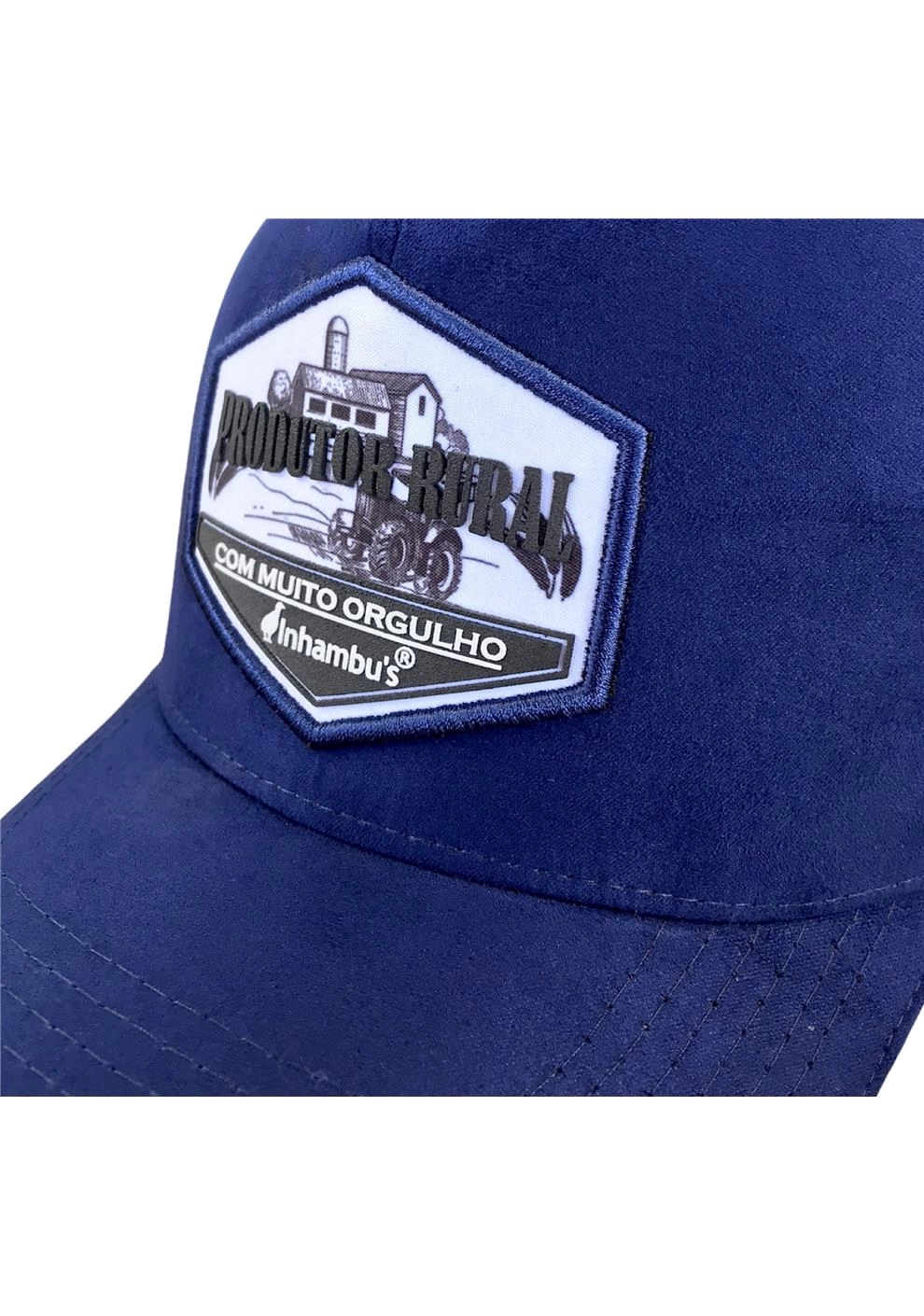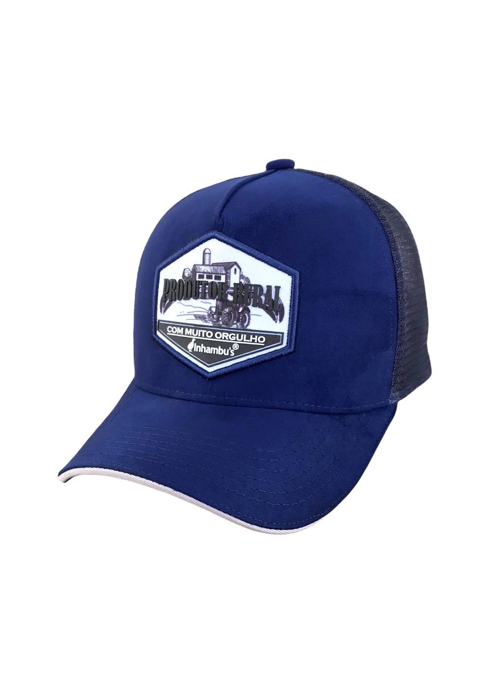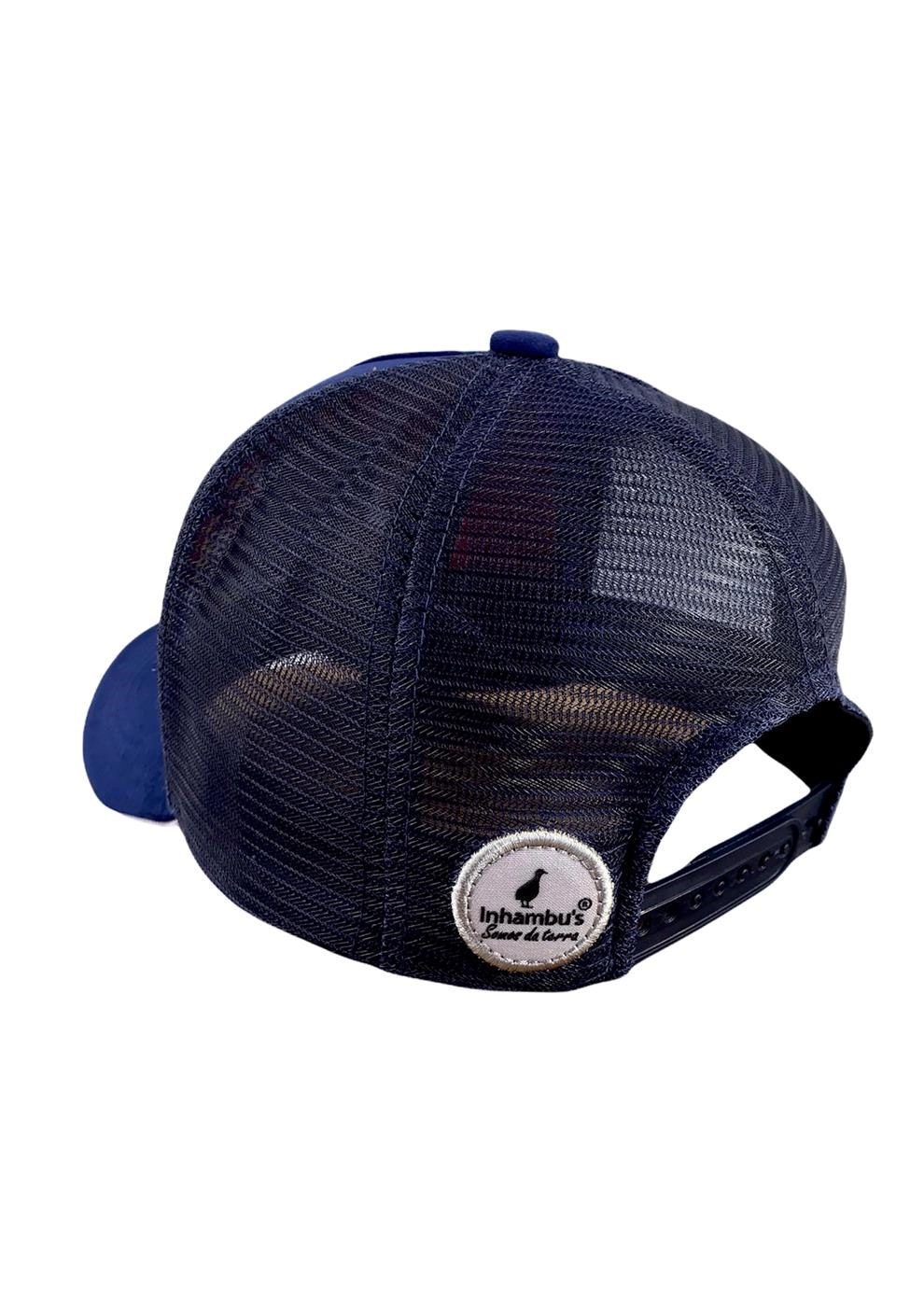 BONÉ INHAMBU'S ESTILO TRUCKER EM CAMURÇA NA CORÂ AZUL MARINHO, VIÉS PERSONALIZADO, ESPELHAMENTO INTERNO, ABA COM 6 COSTURAS + SANDUICHE NA COR GELO, TELAS NA COR AZUL, CARNEIRA LARGA, ENTRETELA DE MEMÓRIA, REGULADOR PLÁSTICO, FORRO PERSONALIZADO, APLIQUE EM PATCH SILK ALTO RELEVO, E APLIQUE EM PATCH TRASEIRO SILKADO ALTO RELEVO.