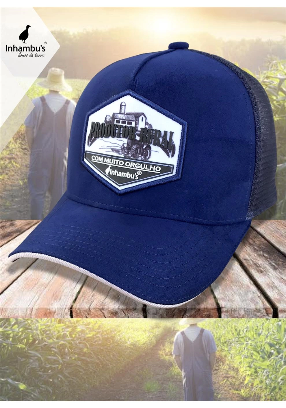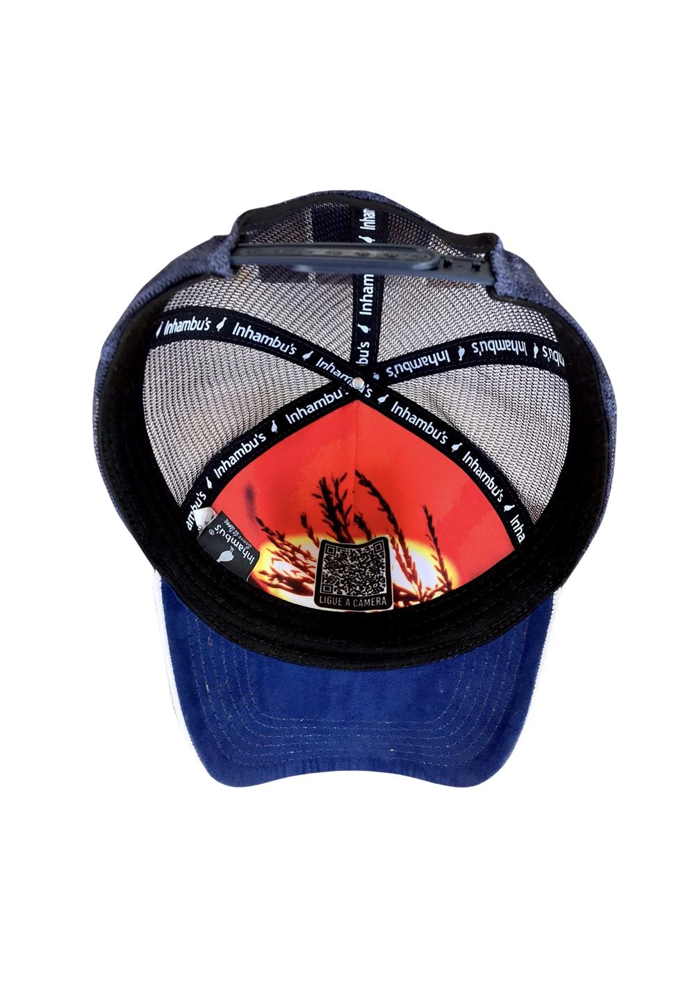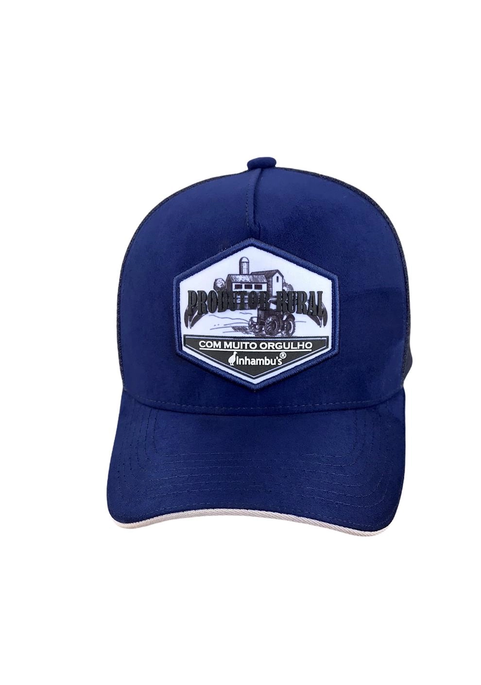 BONÉ INHAMBU'S ESTILO TRUCKER EM CAMURÇA NA CORÂ AZUL MARINHO, VIÉS PERSONALIZADO, ESPELHAMENTO INTERNO, ABA COM 6 COSTURAS + SANDUICHE NA COR GELO, TELAS NA COR AZUL, CARNEIRA LARGA, ENTRETELA DE MEMÓRIA, REGULADOR PLÁSTICO, FORRO PERSONALIZADO, APLIQUE EM PATCH SILK ALTO RELEVO, E APLIQUE EM PATCH TRASEIRO SILKADO ALTO RELEVO.