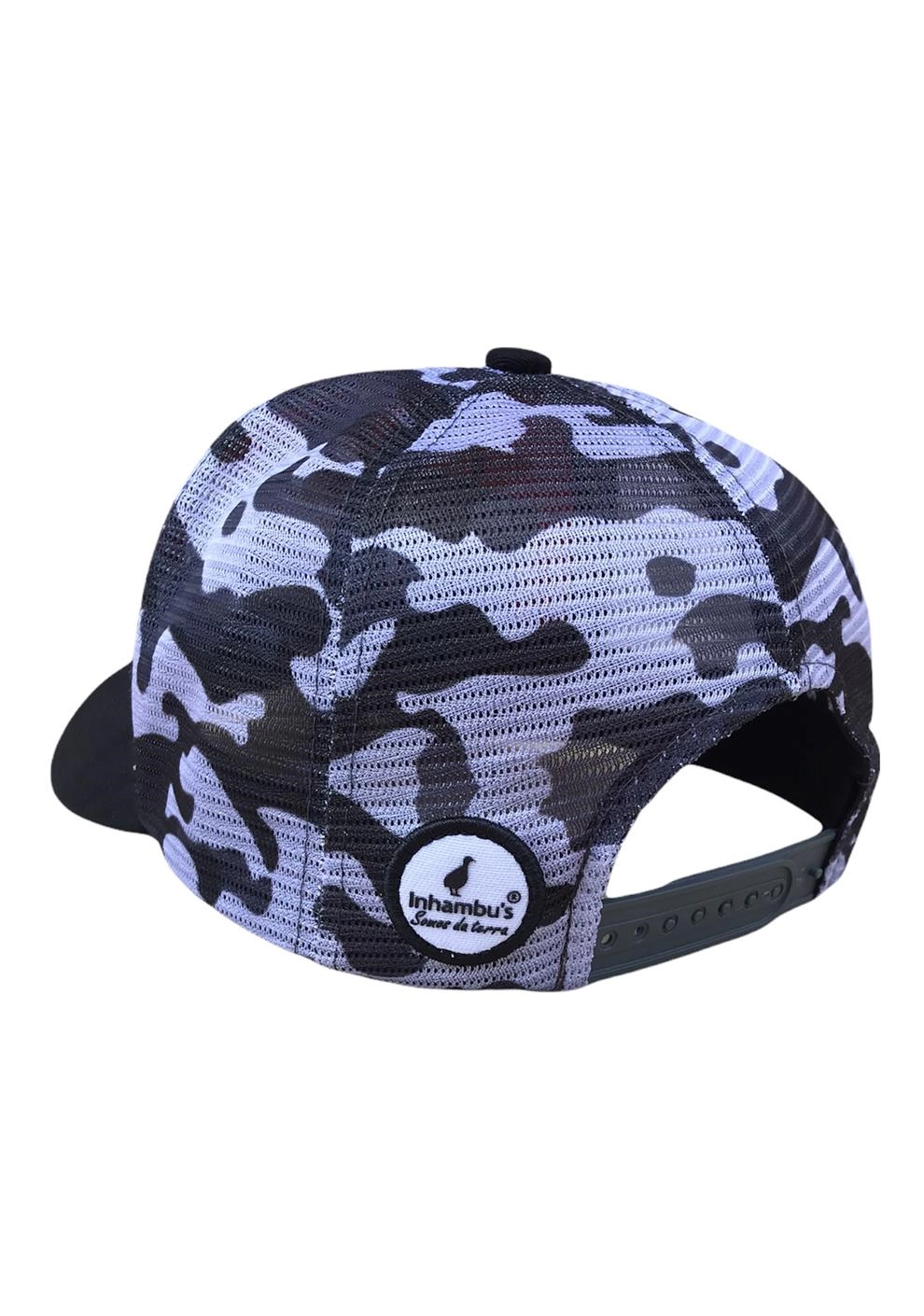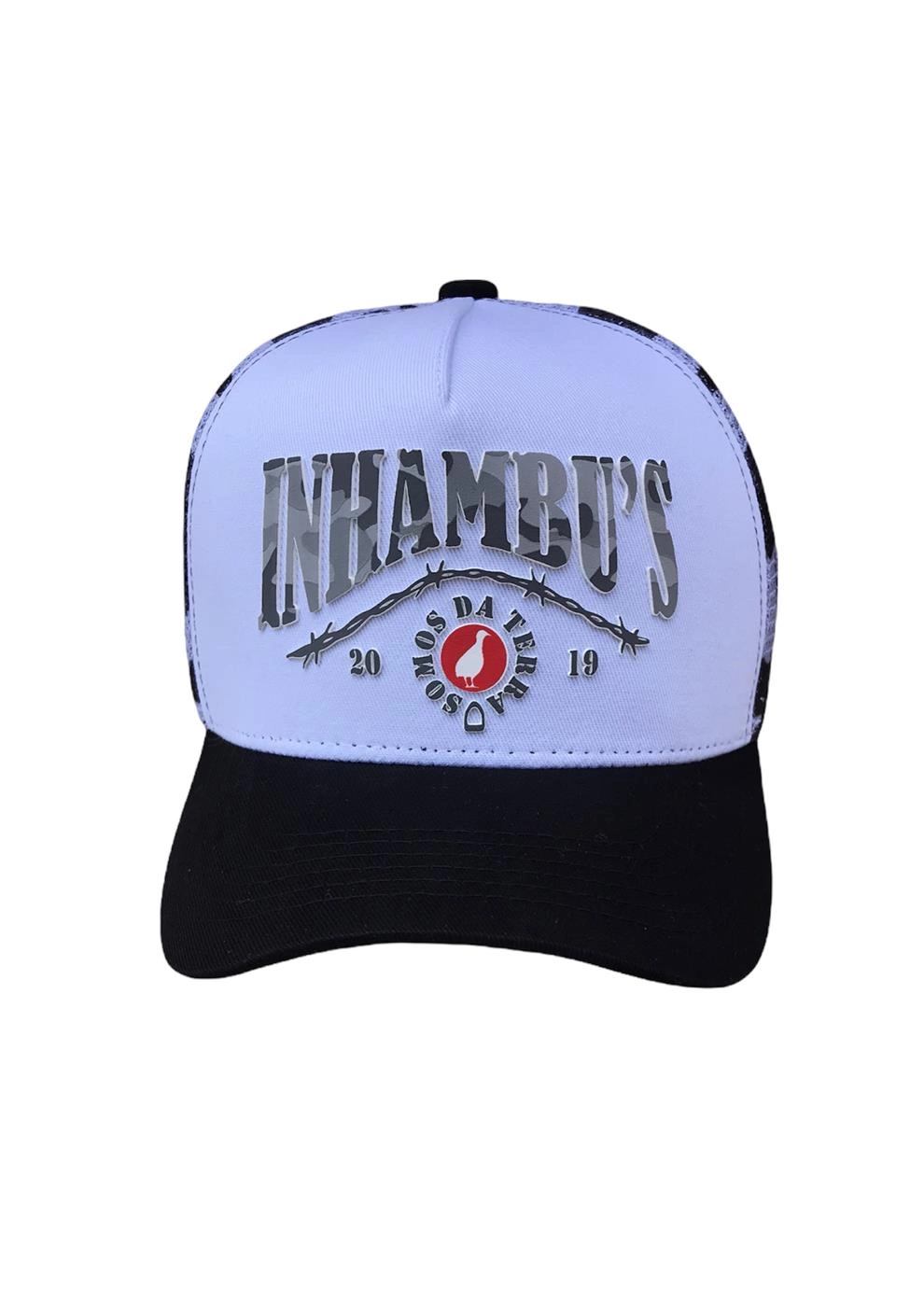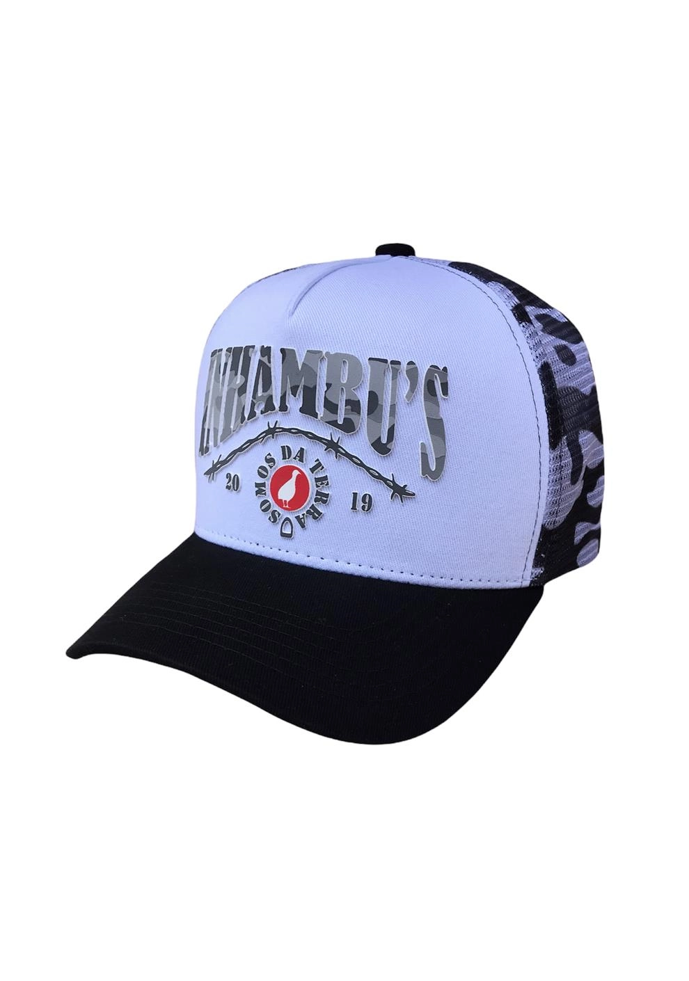 BONÉ INHAMBU'S ESTILO TRUCKER EM SARJA NA COR BRANCO, VIÉS PERSONALIZADO, ESPELHAMENTO INTERNO, ABA COM 6 COSTURAS NA COR PRETO, TELAS NA COR CAMUFLADO, CARNEIRA LARGA, ENTRETELA DE MEMÓRIA, REGULADOR PLÁSTICO, FORRO PERSONALIZADO, APLIQUE TRASEIRO EM PATCH NA COR PRETO COM SILK ALTO RELEVO LOGOMARCA, APLIQUE FRONTAL EM SILK ALTO RELEVO.