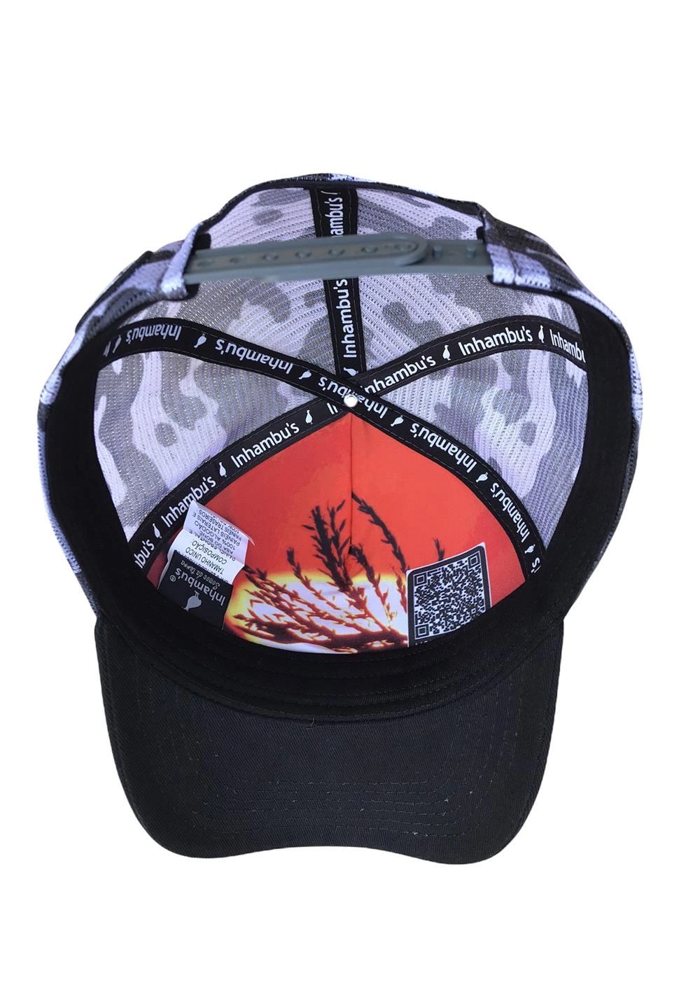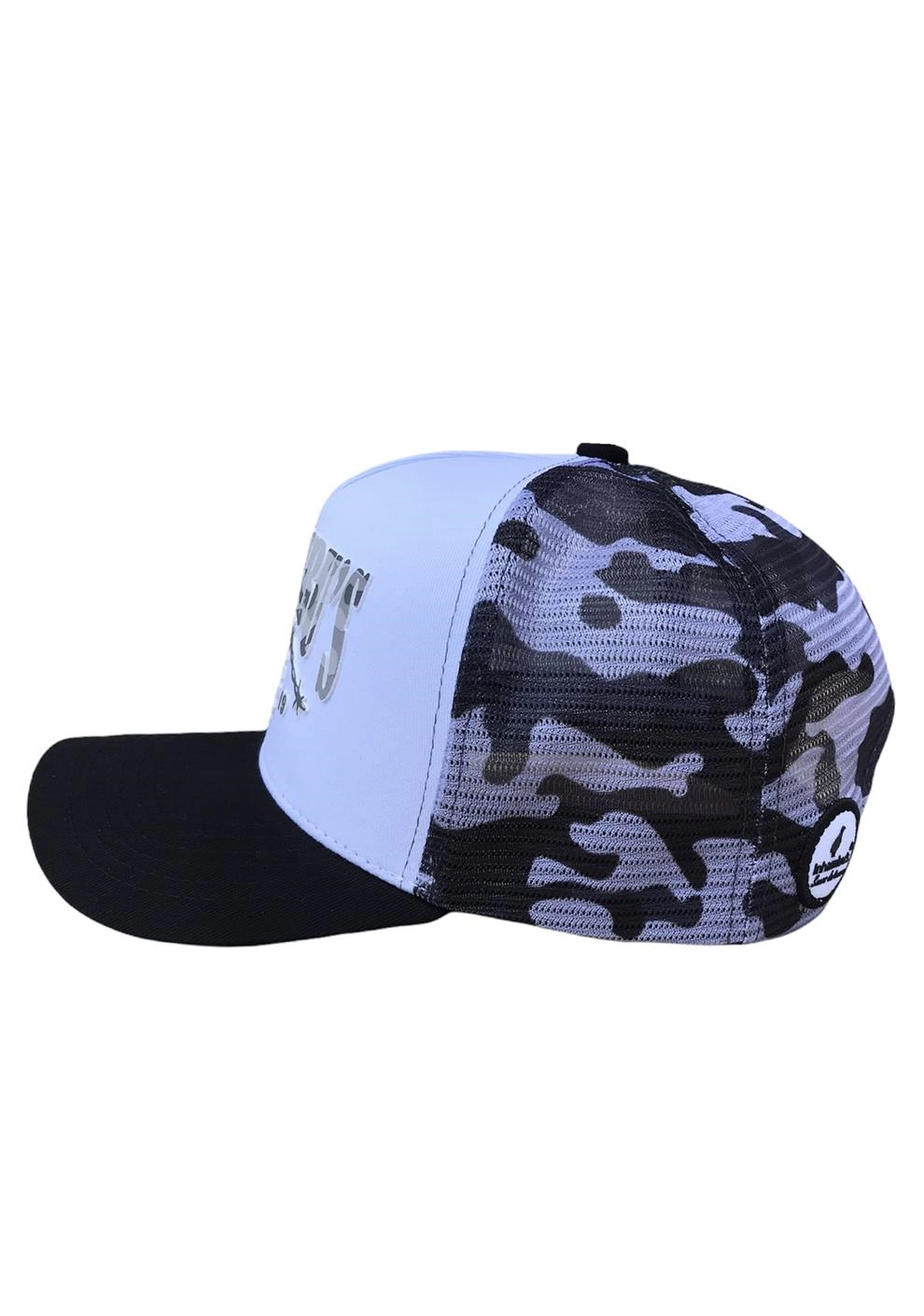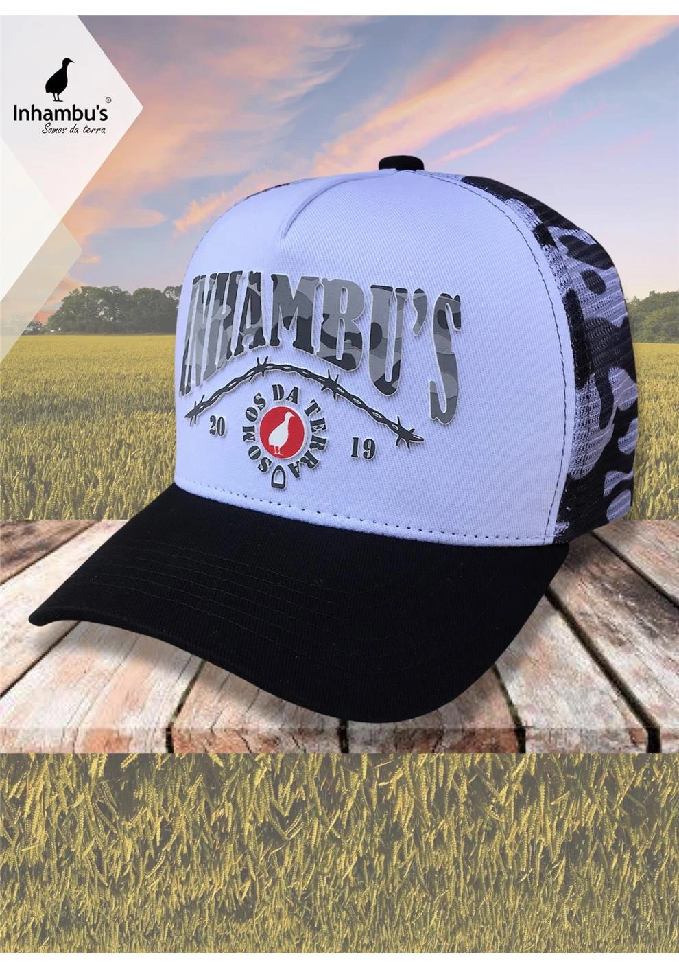 BONÉ INHAMBU'S ESTILO TRUCKER EM SARJA NA COR BRANCO, VIÉS PERSONALIZADO, ESPELHAMENTO INTERNO, ABA COM 6 COSTURAS NA COR PRETO, TELAS NA COR CAMUFLADO, CARNEIRA LARGA, ENTRETELA DE MEMÓRIA, REGULADOR PLÁSTICO, FORRO PERSONALIZADO, APLIQUE TRASEIRO EM PATCH NA COR PRETO COM SILK ALTO RELEVO LOGOMARCA, APLIQUE FRONTAL EM SILK ALTO RELEVO.