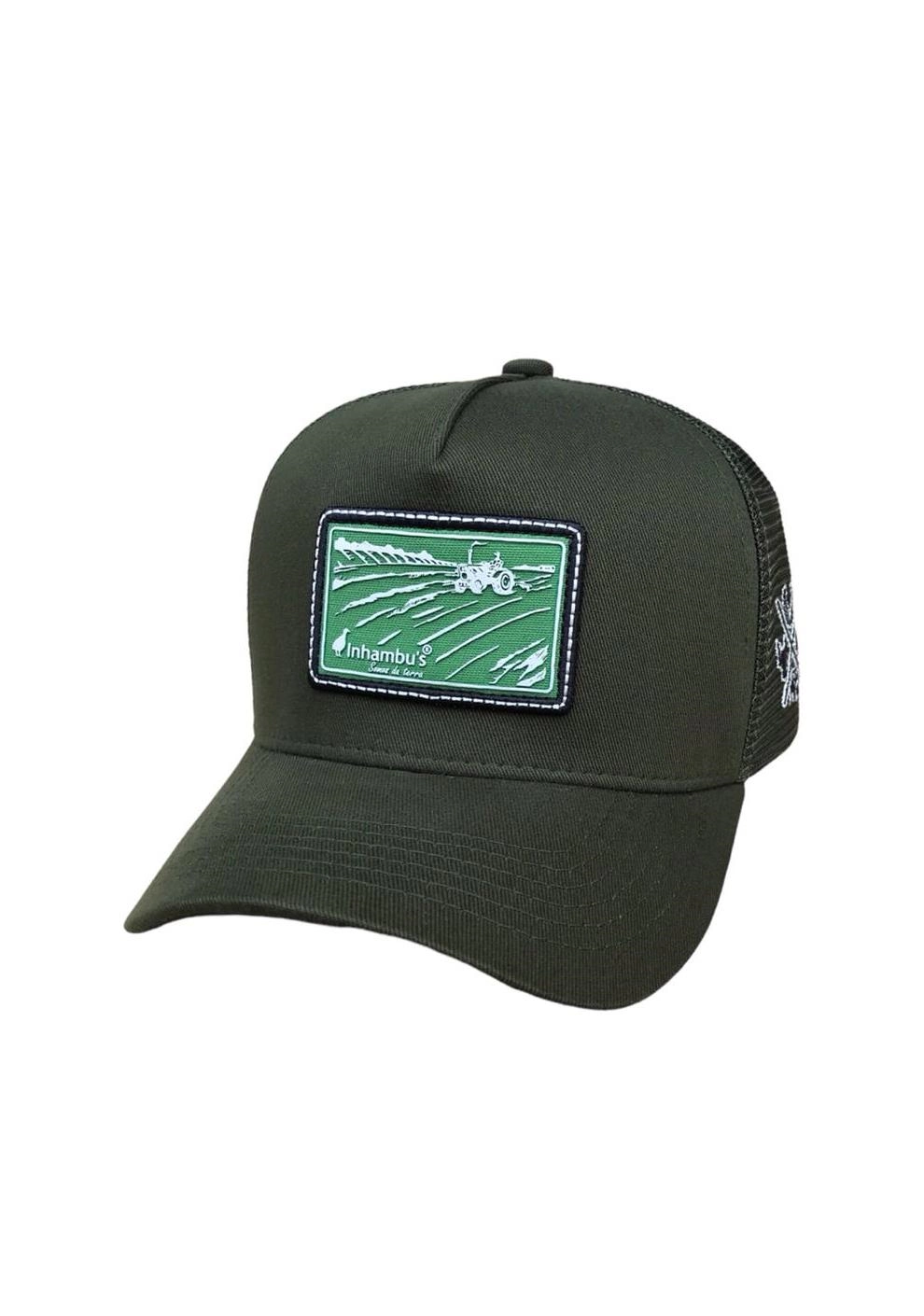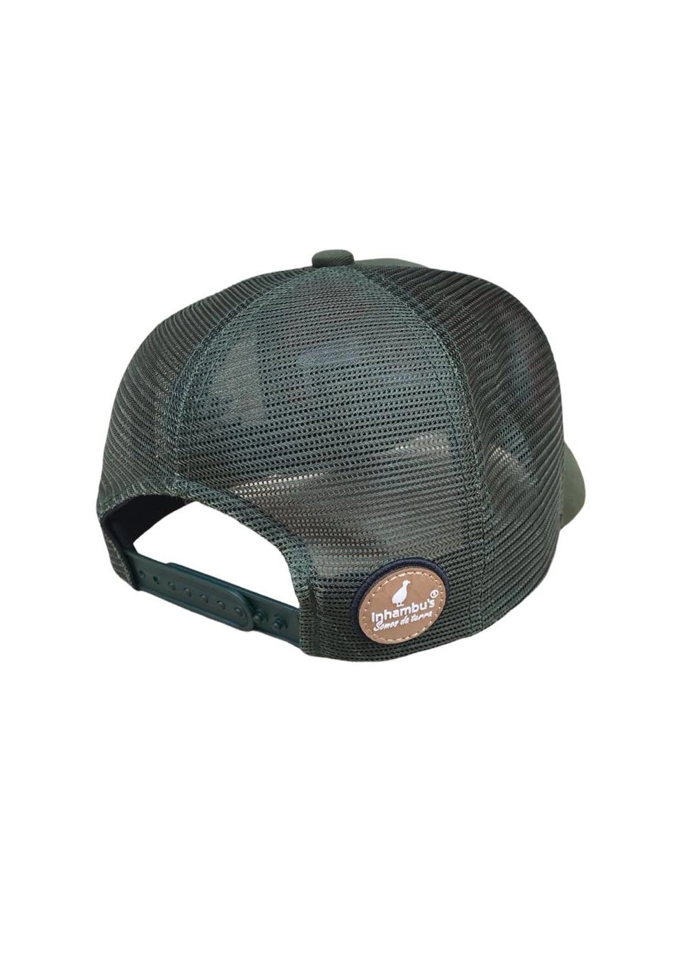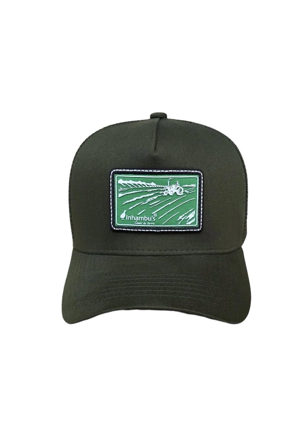BONÉ INHAMBU'S ESTILO TRUCKER COM FRENTE EM SARJA NA COR VERDE MUSGO, VIÉS PERSONALIZADO, FORRO PERSONALIZADO,ESPELHAMENTO INTERNO, ABA COM 6 COSTURAS NA COR VERDE MUSGO, TELA NA COR VERDE, CARNEIRA LARGA, FORRO PERSONALIZADO, ENTRETELA DE MEMORIA, REGULADOR PLÁSTICO, APLIQUE FRONTAL EM PATCH COM SILK ALTO RELEVO, BORDADO LATERAL E APLIQUE TRASEIRO EM COURO E SILK ALTO RELEVO.