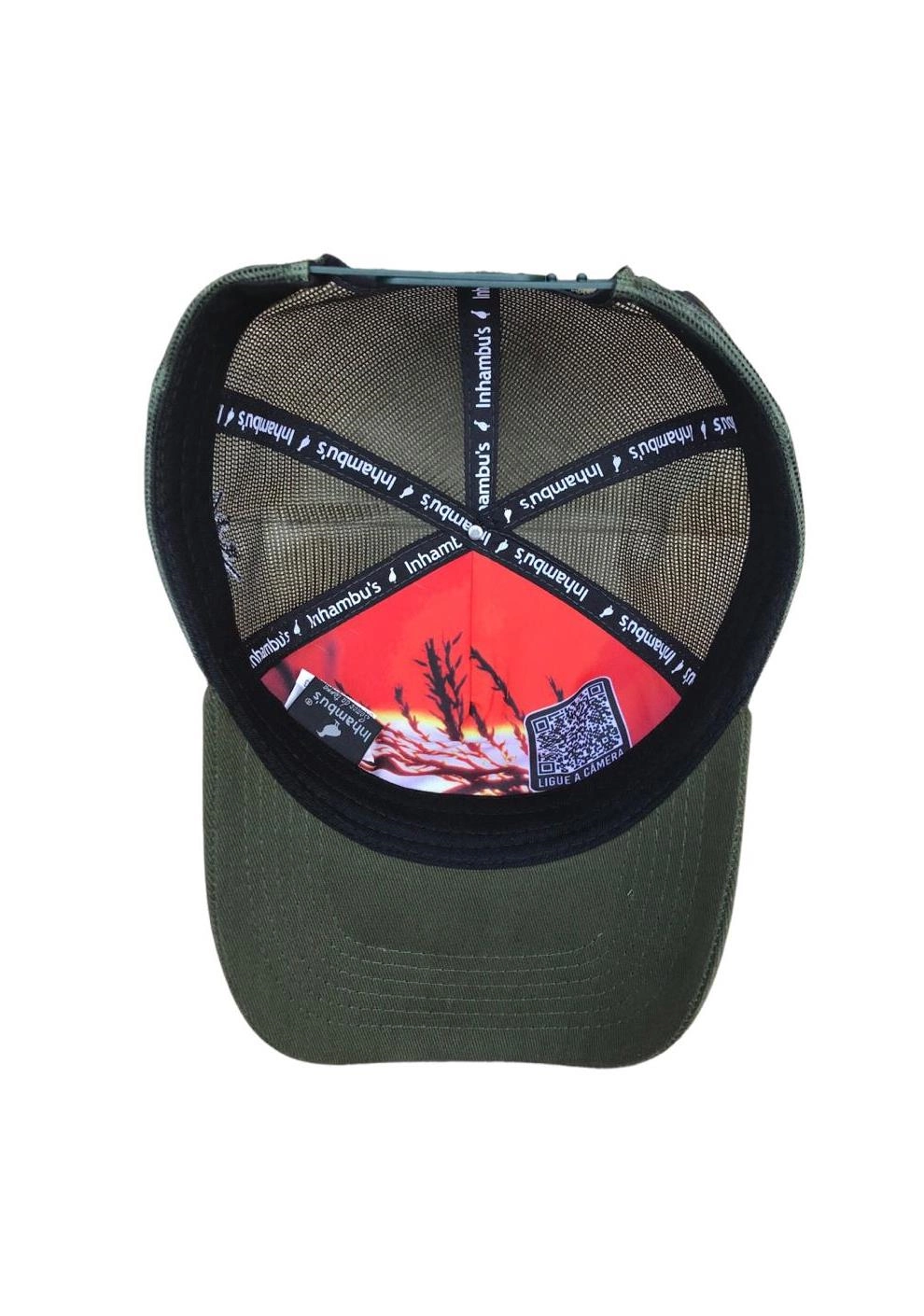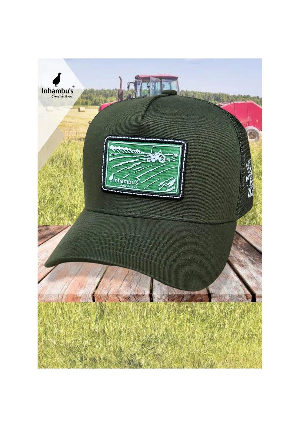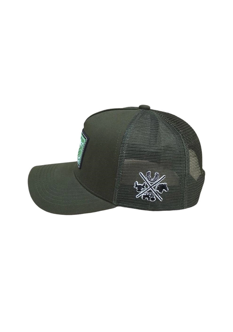 BONÉ INHAMBU'S ESTILO TRUCKER COM FRENTE EM SARJA NA COR VERDE MUSGO, VIÉS PERSONALIZADO, FORRO PERSONALIZADO,ESPELHAMENTO INTERNO, ABA COM 6 COSTURAS NA COR VERDE MUSGO, TELA NA COR VERDE, CARNEIRA LARGA, FORRO PERSONALIZADO, ENTRETELA DE MEMORIA, REGULADOR PLÁSTICO, APLIQUE FRONTAL EM PATCH COM SILK ALTO RELEVO, BORDADO LATERAL E APLIQUE TRASEIRO EM COURO E SILK ALTO RELEVO.