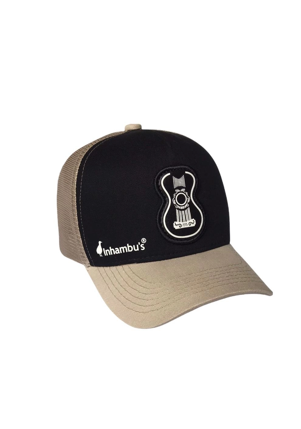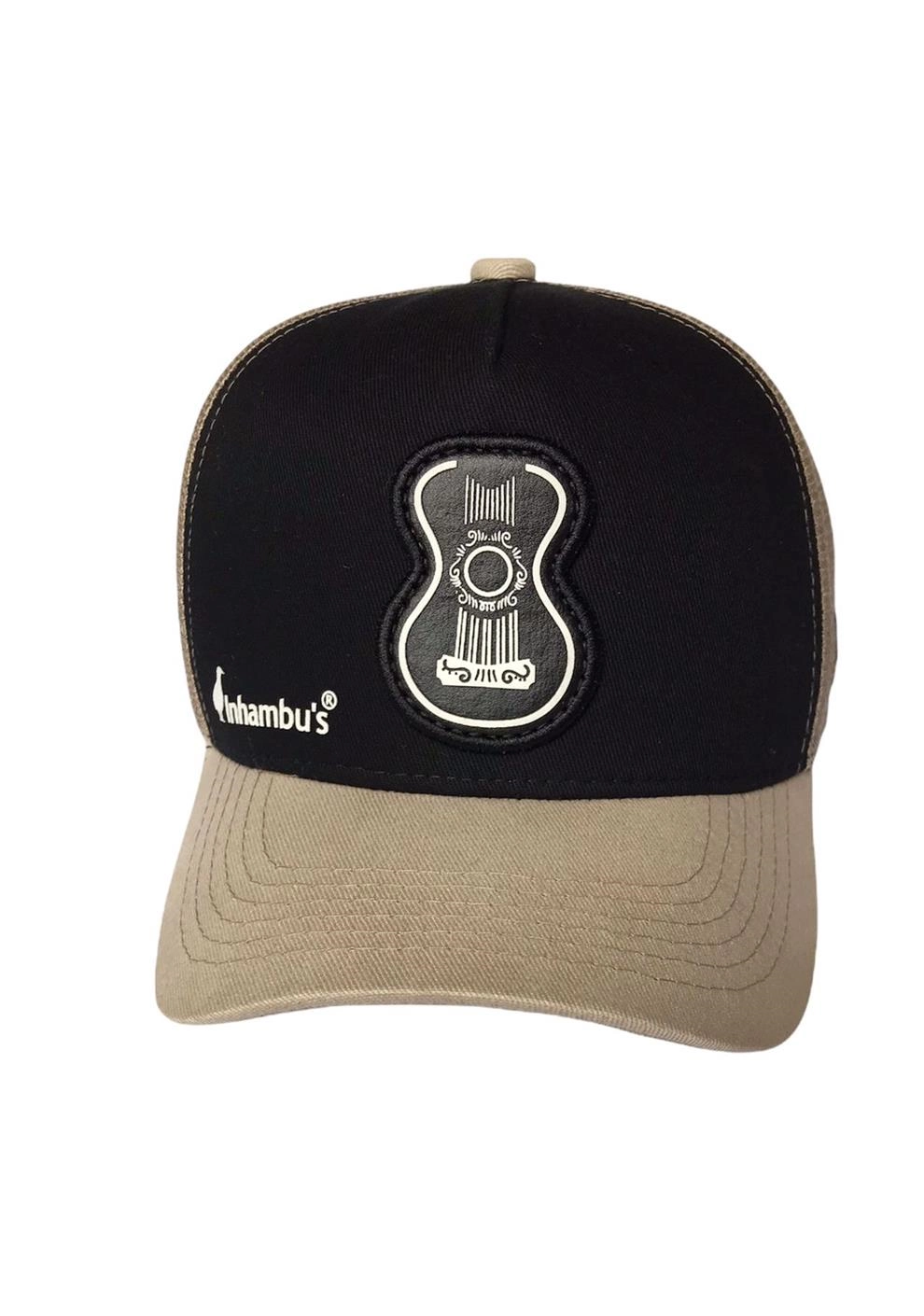 BONÉ INHAMBU'S ABA CURVA ESTILO TRUCKER EM SARJA NA COR PRETO, VIÉS PERSONALIZADO, ESPELHAMENTO INTERNO, ABA COM 6 COSTURAS BEGE, TELA NA COR BEGE, CARNEIRA LARGA, ENTRETELA DE MEMÓRIA, REGULADOR PLÁSTICO, APLIQUE EM COURO COM SILK ALTO RELEVO FRONTAL, BORDADO LATERAL E APLIQUE TRASEIRO EM PATCH SILKADO.