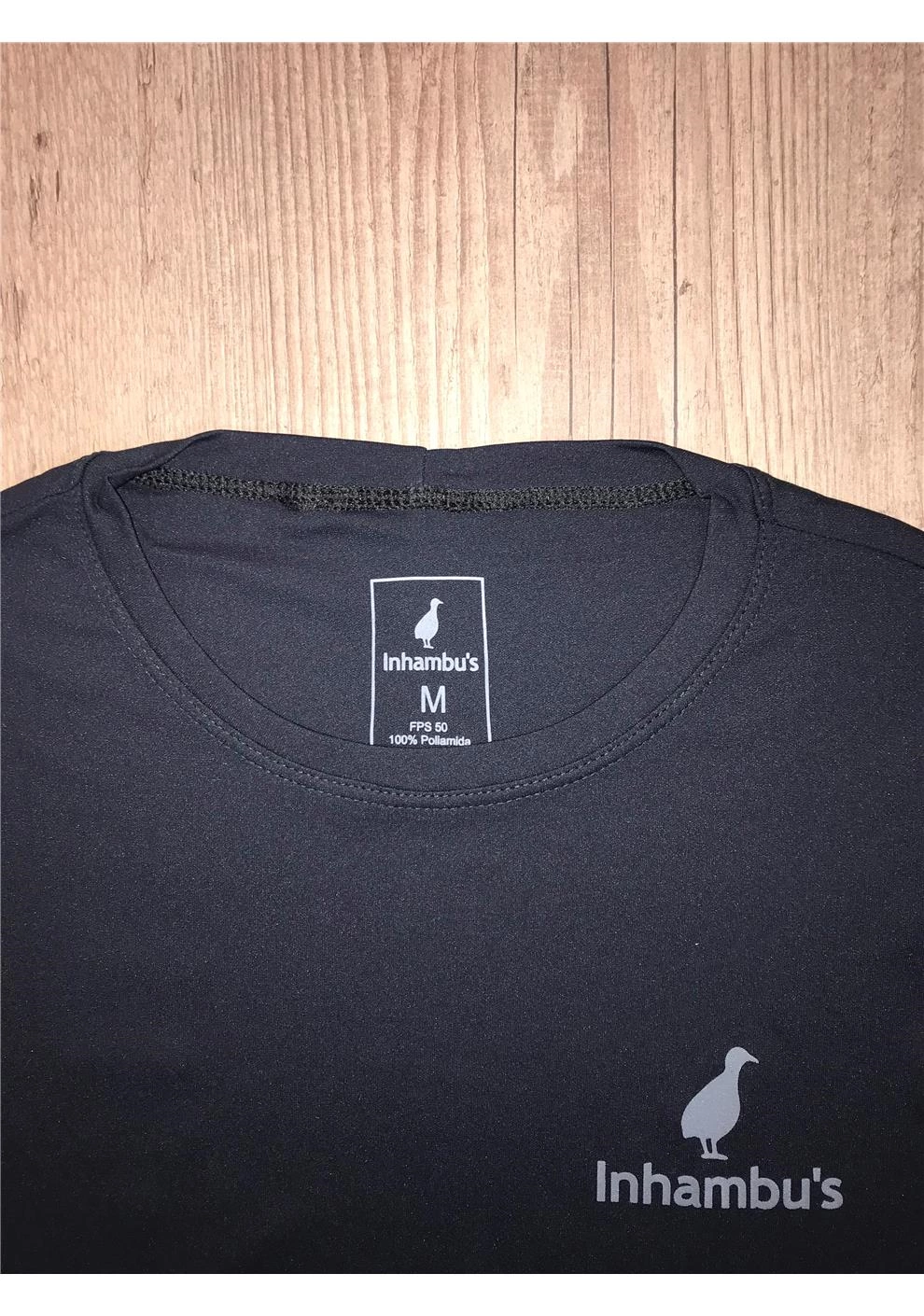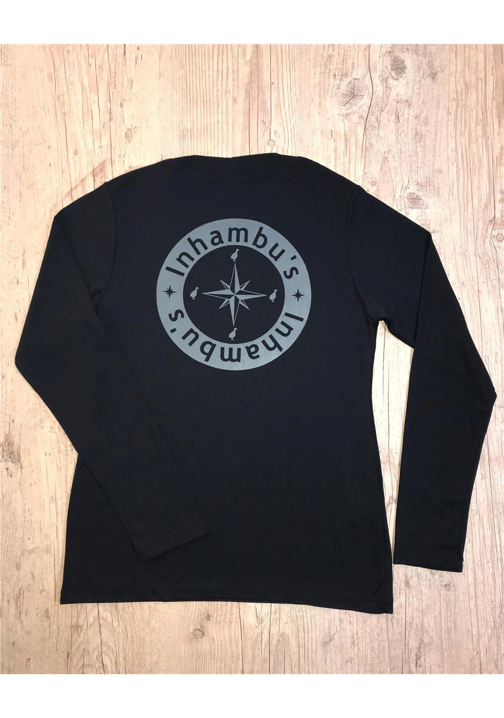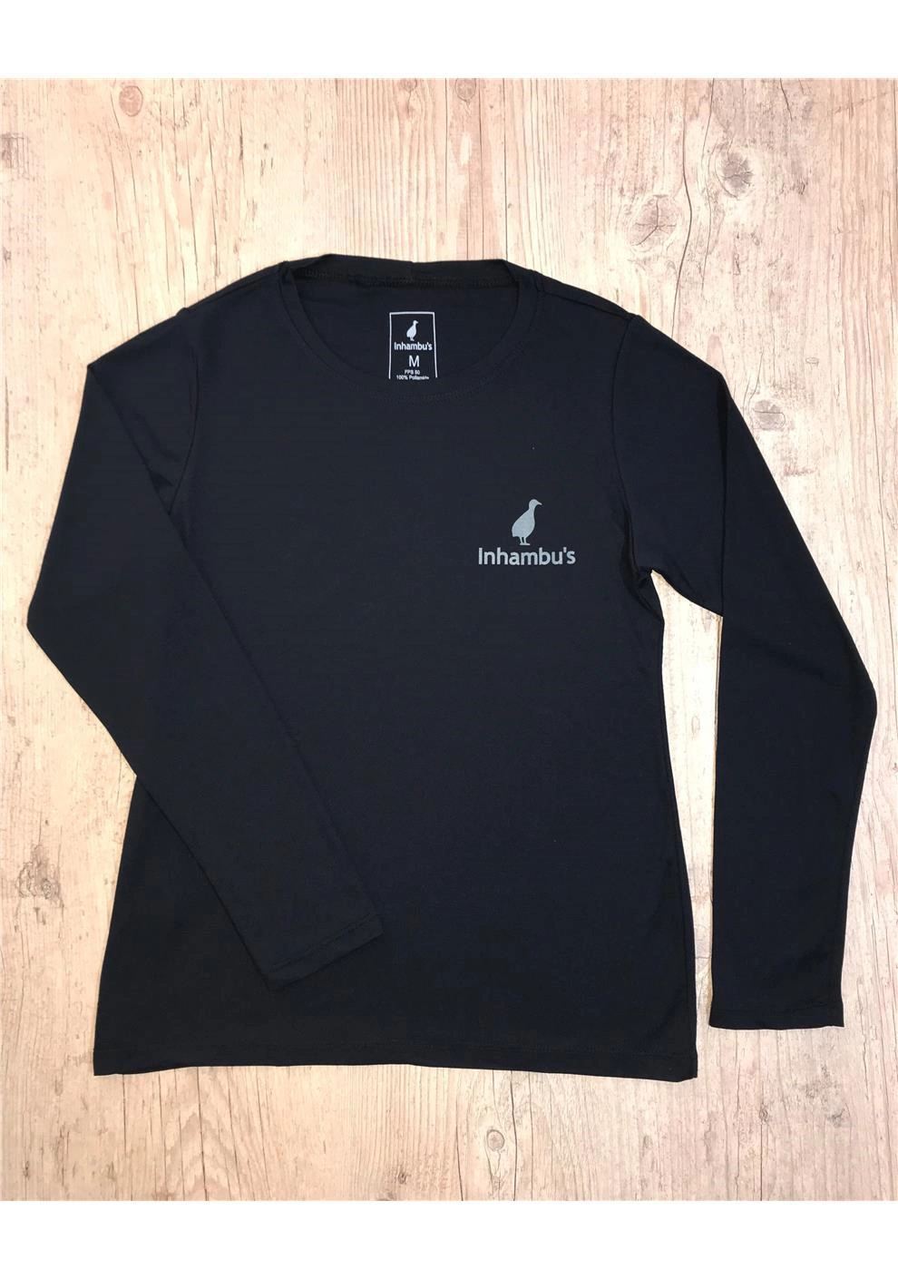CAMISETA FEMININA EM MALHA 100% POLIAMIDA LISO MANGA LONGA, COR PRETO, FATOR DE PROTEÇÃO UV 50, GOLA REDONDA, MANGA BAINHA, SILK FRONTAL E TRASEIRO EM UMA COR.