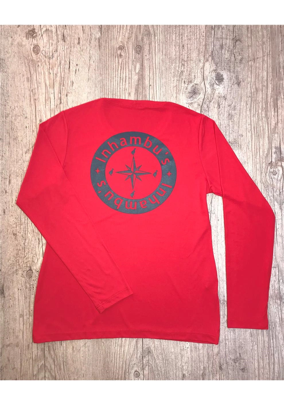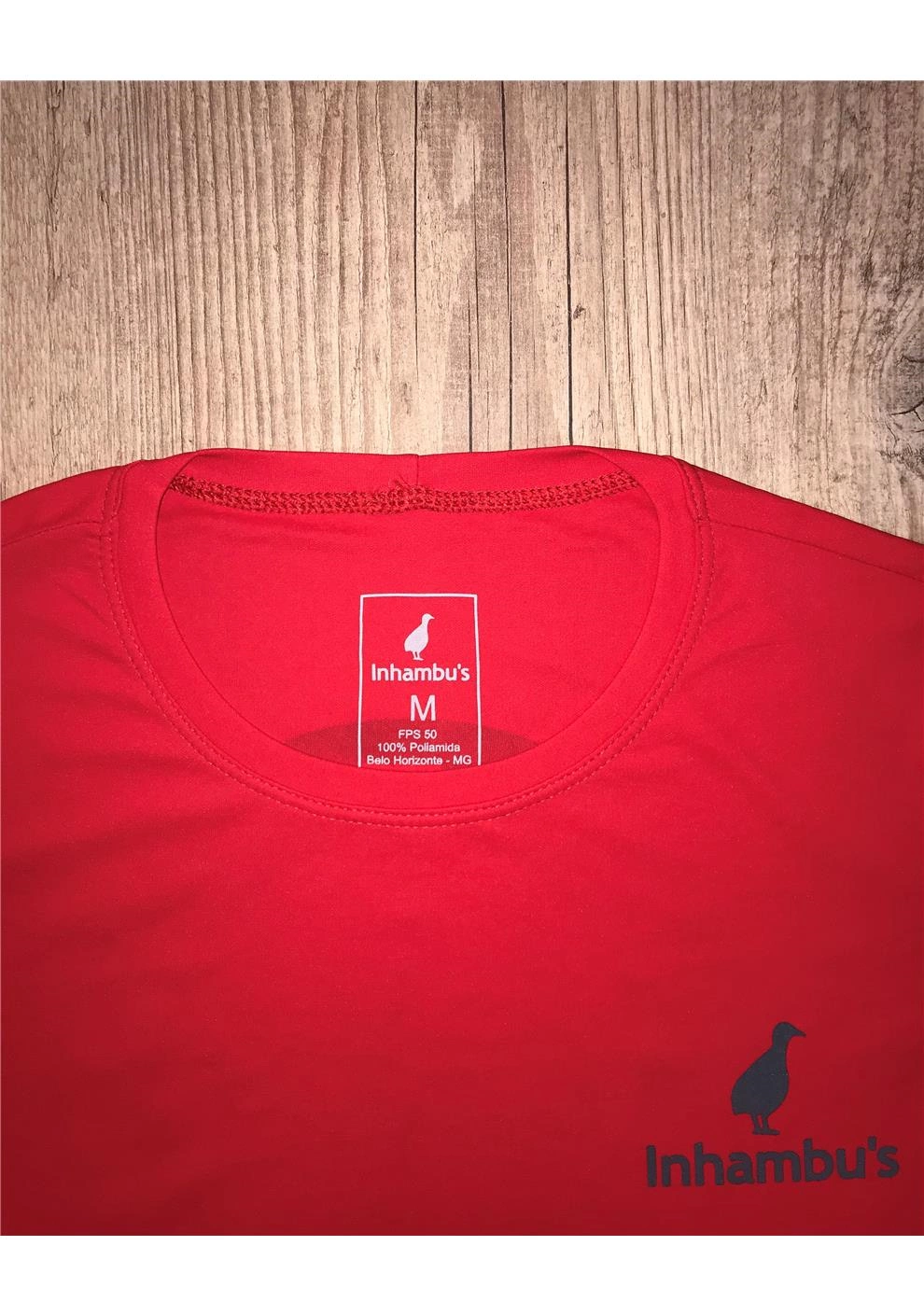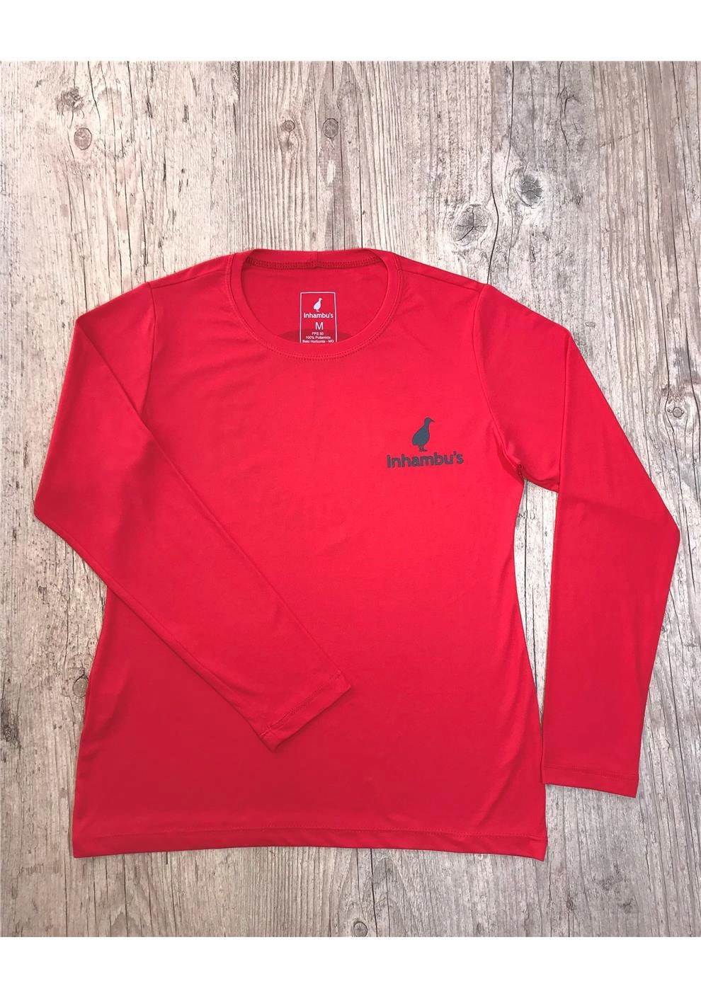CAMISETA FEMININA EM MALHA 100% POLIAMIDA LISO MANGA LONGA, COR VERMELHO, FATOR DE PROTEÇÃO UV 50, GOLA REDONDA, MANGA BAINHA, SILK FRONTAL E TRASEIRO EM UMA COR.
