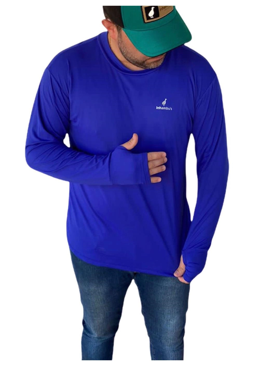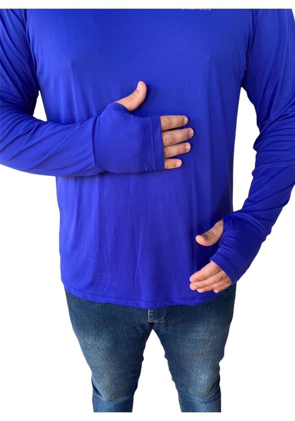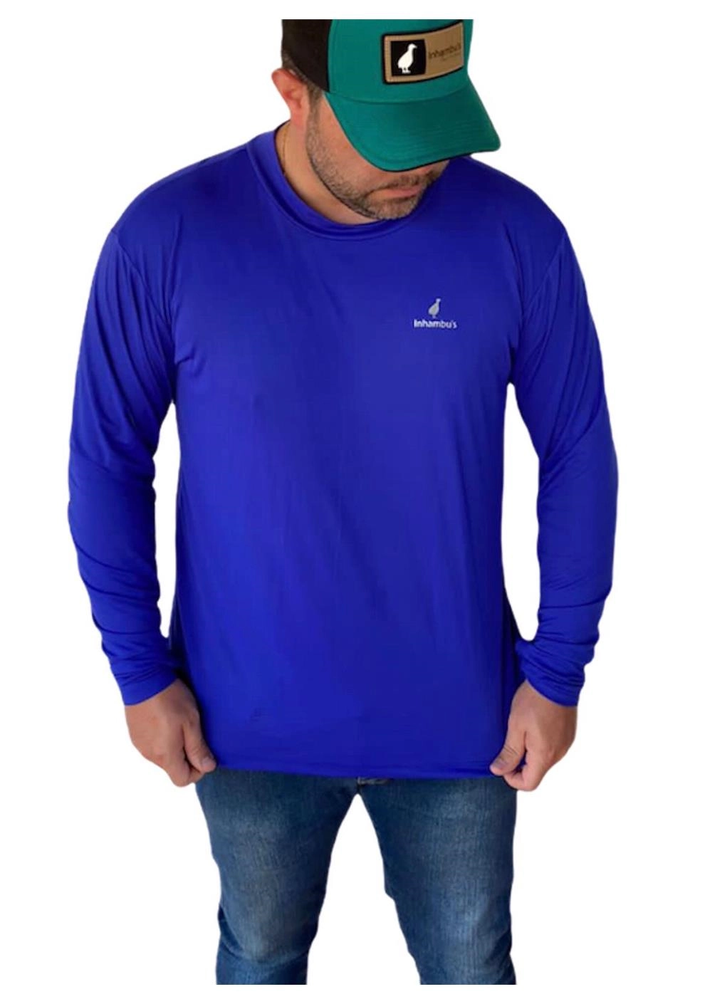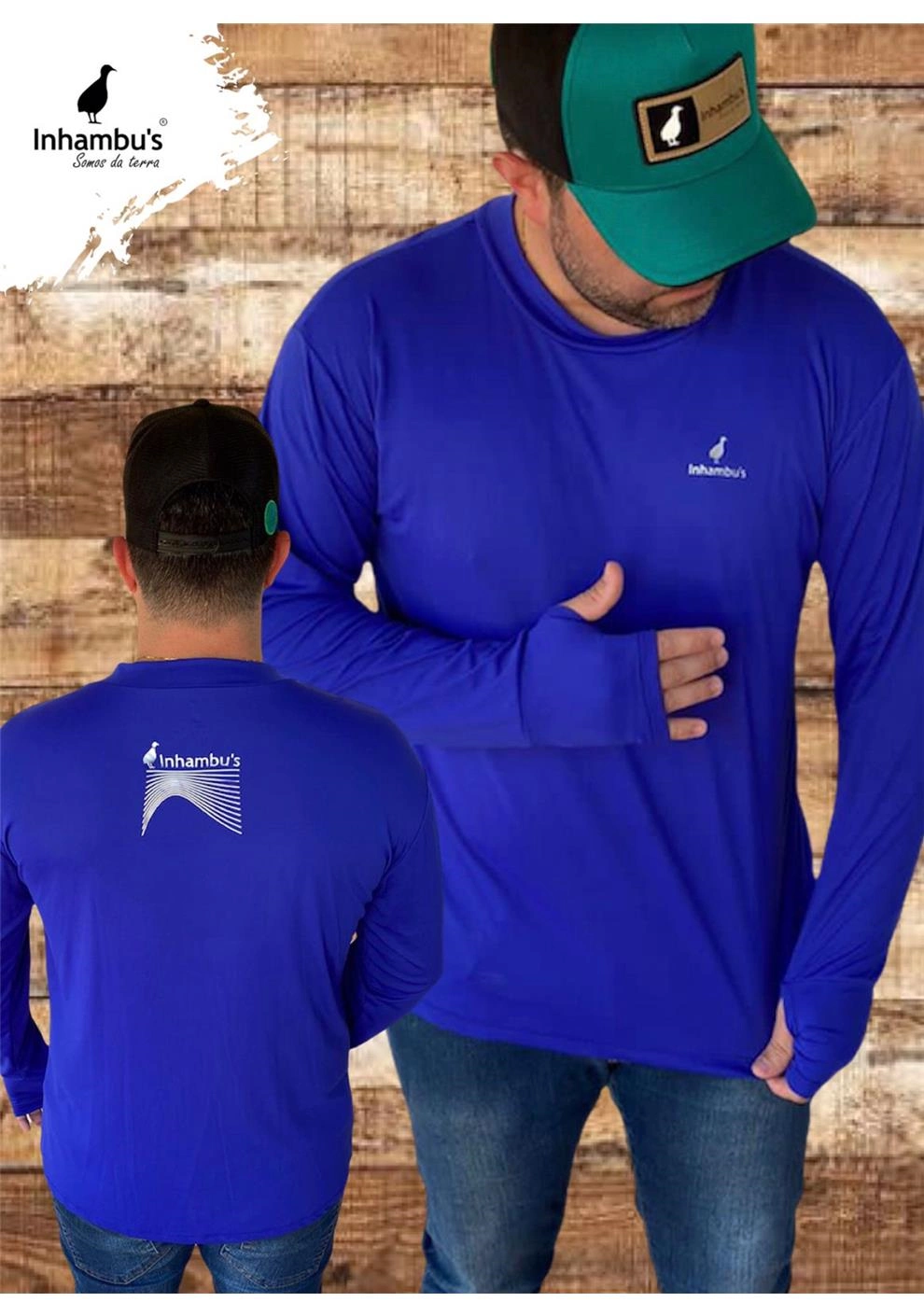 CAMISETA MASCULINA EM MALHA 100% POLIAMIDA LISO MANGA LONGA, COR AZUL MARINHO, FATOR DE PROTEÇÃO UV 50, GOLA REDONDA, MANGA BAINHA, SILK FRONTAL E TRASEIRO EM UMA COR.