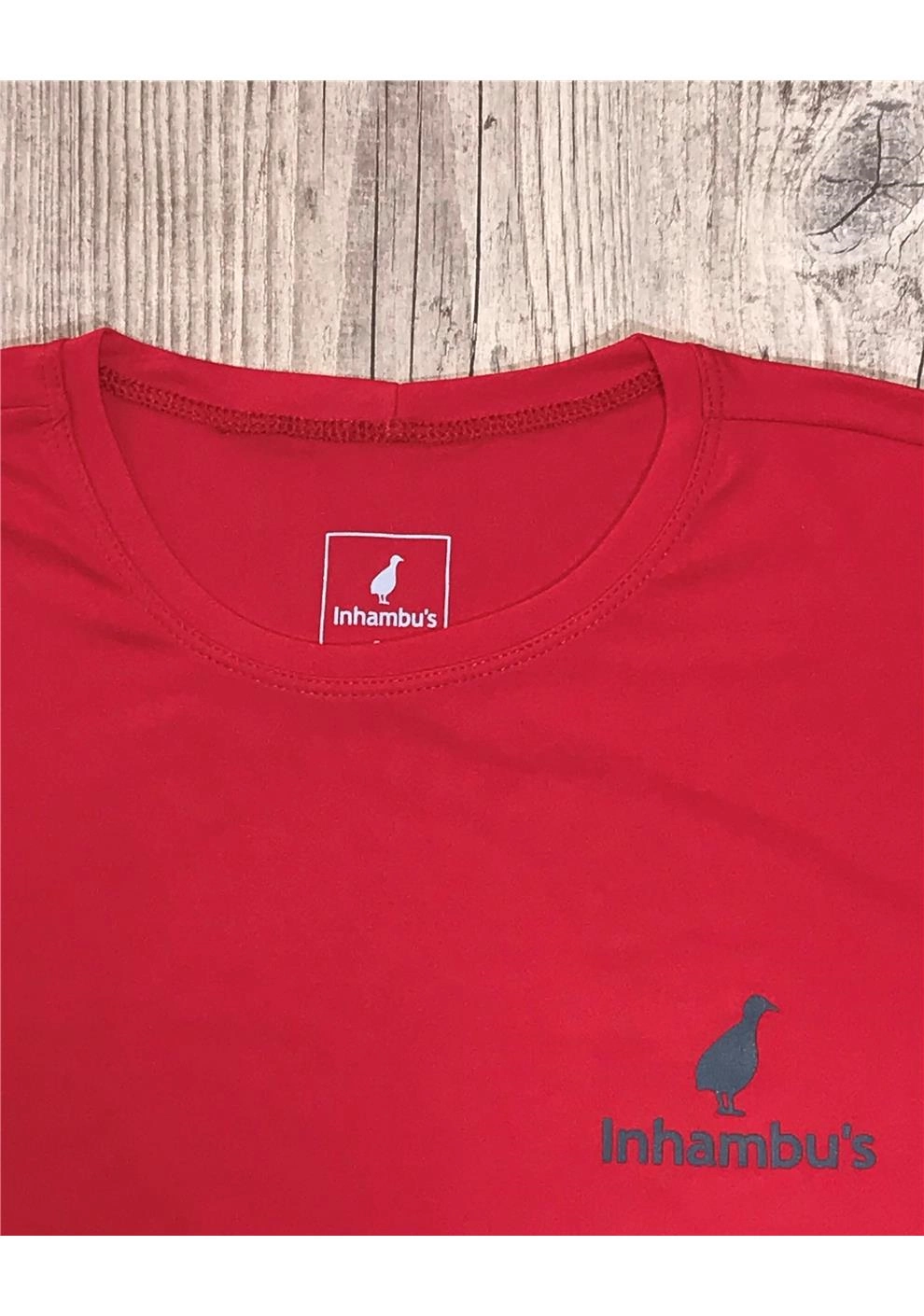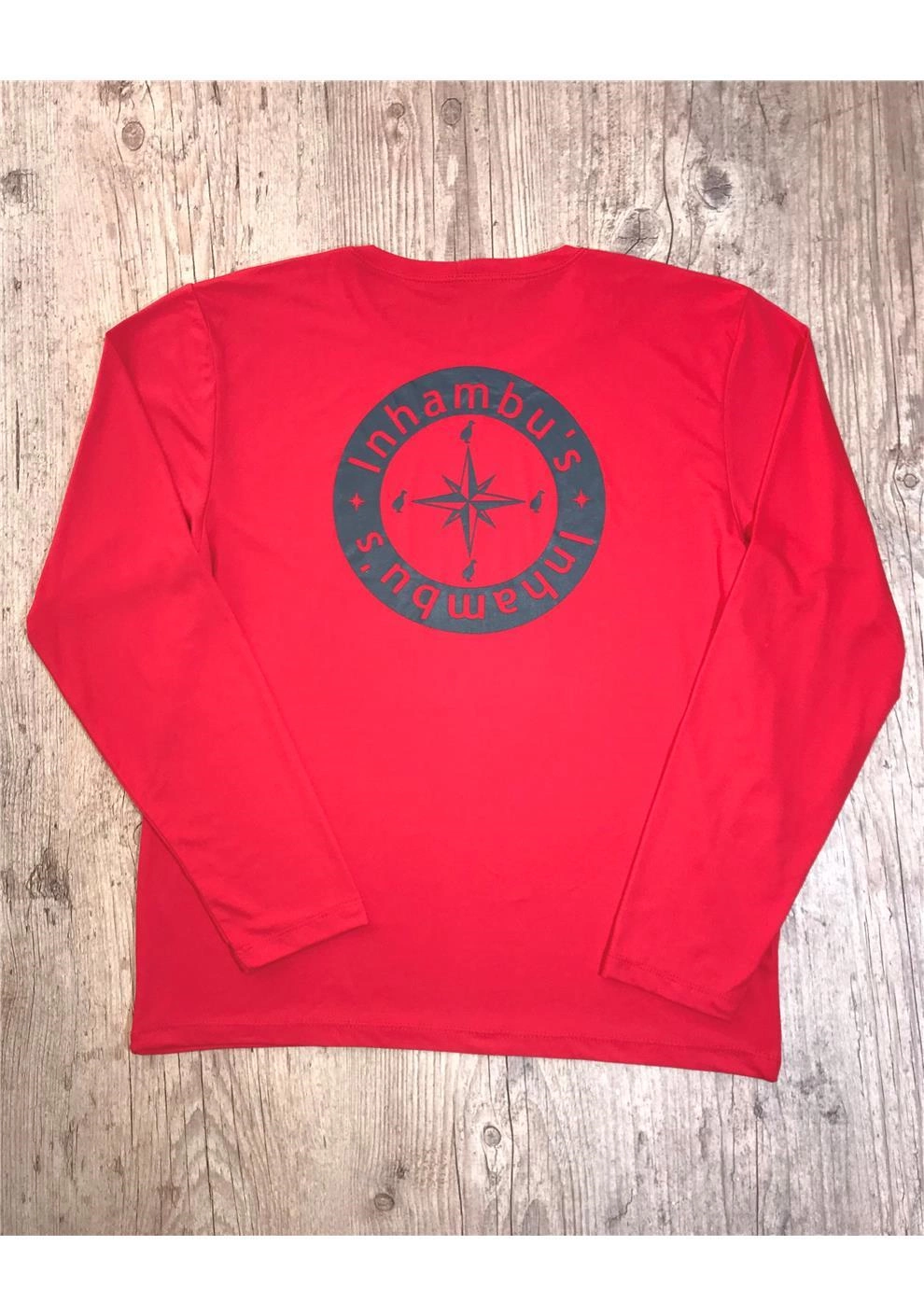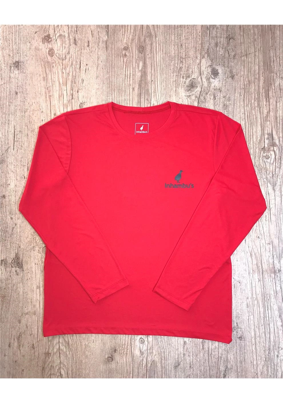 CAMISETA MASCULINA EM MALHA 100% POLIAMIDA LISO MANGA LONGA, COR VERMELHO, FATOR DE PROTEÇÃO UV 50, GOLA REDONDA, MANGA BAINHA, SILK FRONTAL E TRASEIRO EM UMA COR.