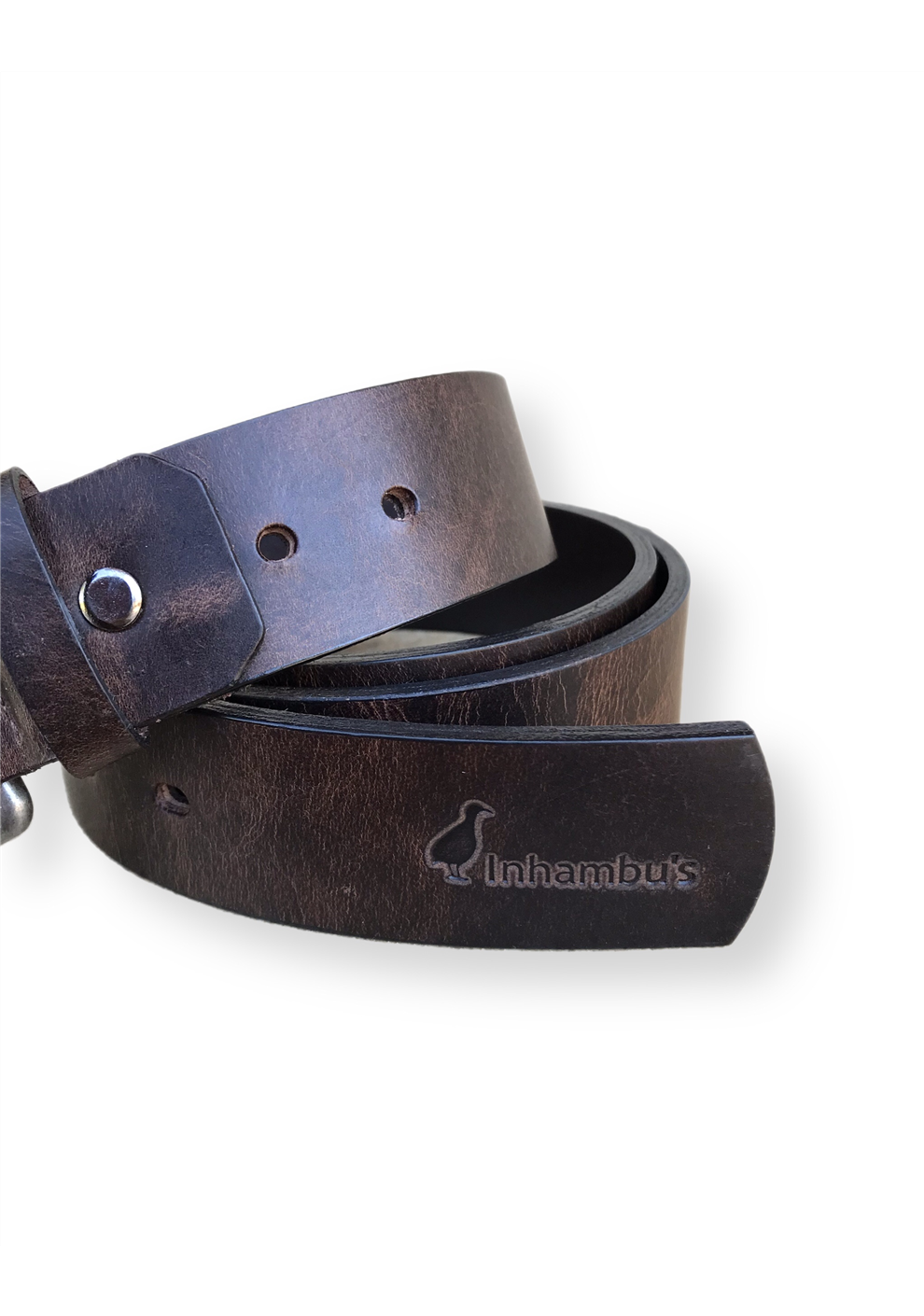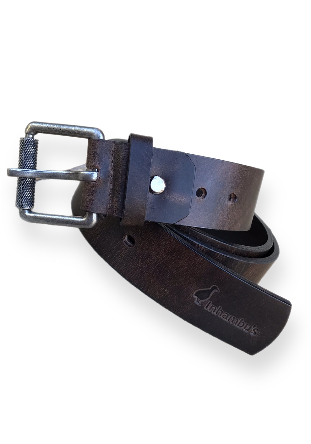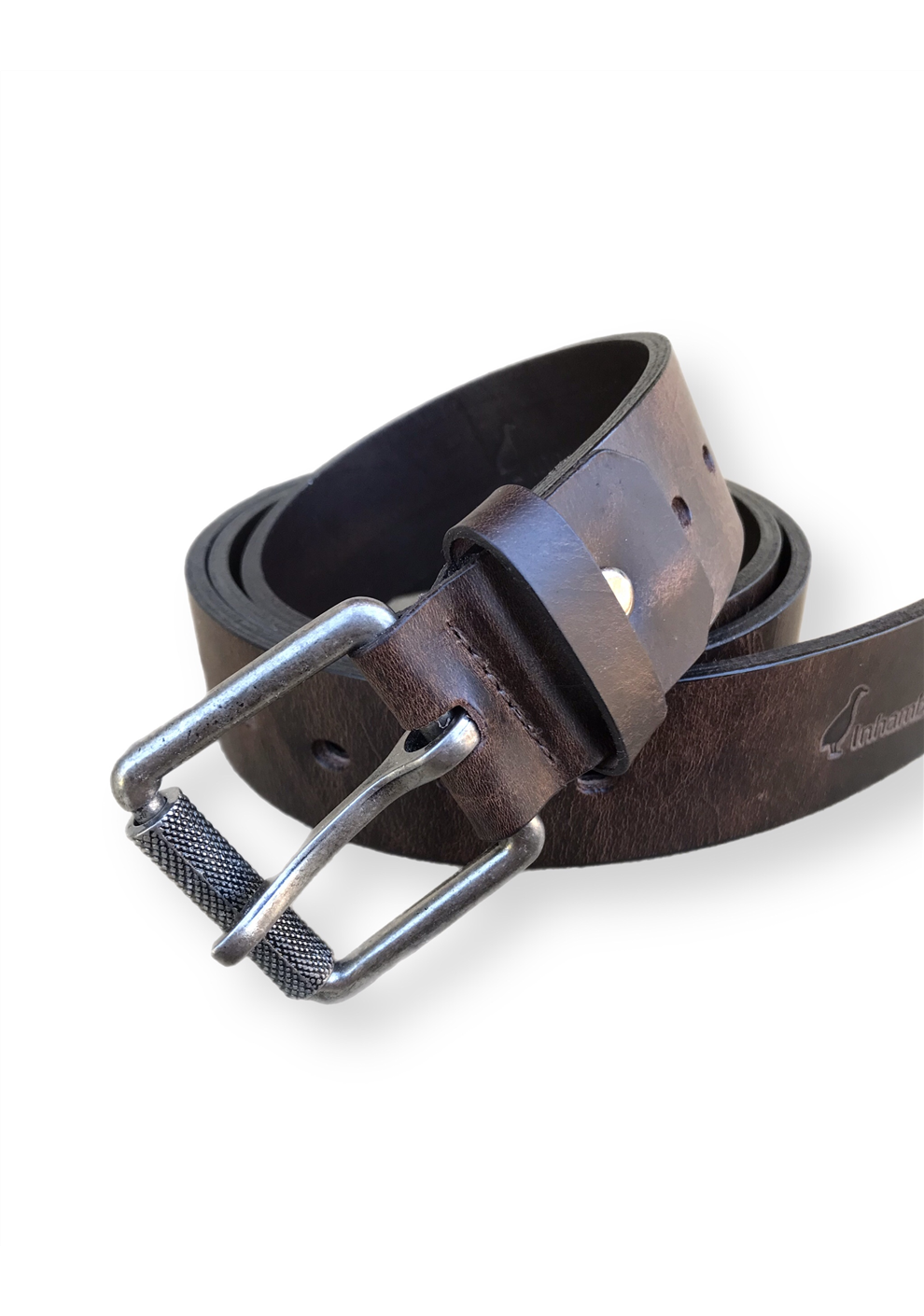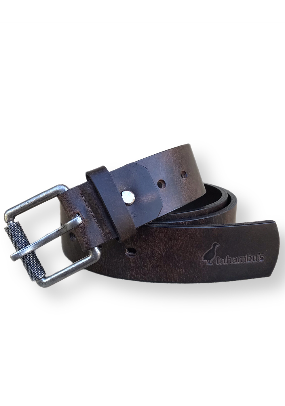 CINTO EM COURO LEGÍTIMO NA COR FÓSSIL CHOCOLATE, COM 3 OPÇÕES DE REGULAGEM DE TAMANHO NA FIVELA, LARGURA 4CM.